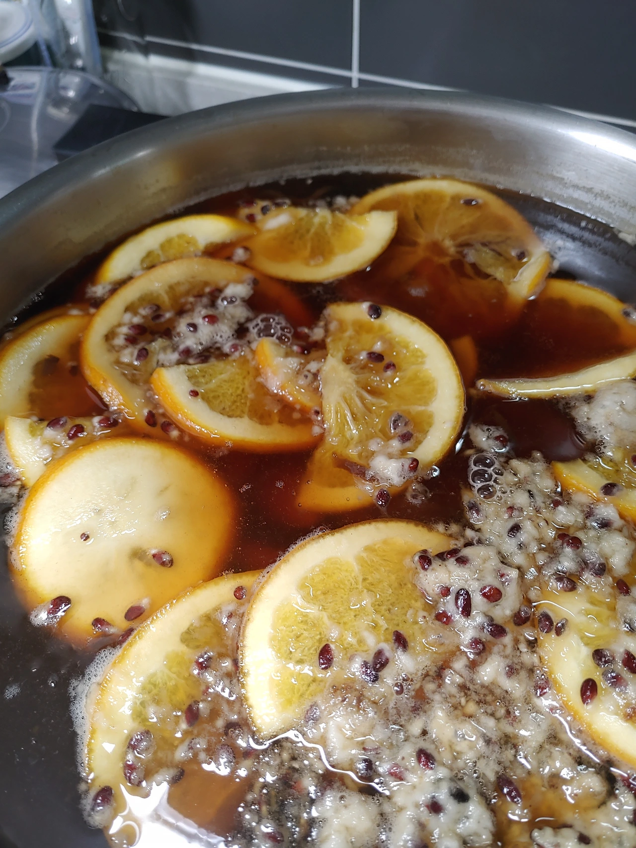 얼굴만 한 하귤청과 으름 속청을 듬뿍 넣고 밑국물 만들어 본다. 공식은 없다. 그때그때 냉장도 털어 넣는다. 끓여서 한 김 식혀 부으면 1차는 끝. 3일 후 다시 국말만 끓여 식혀서 붓고 냉장보관.