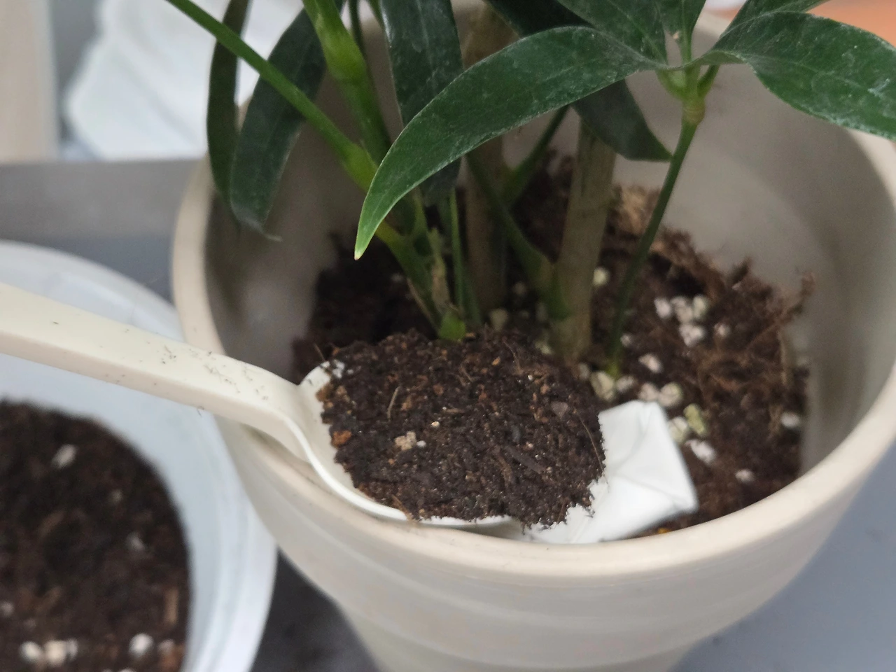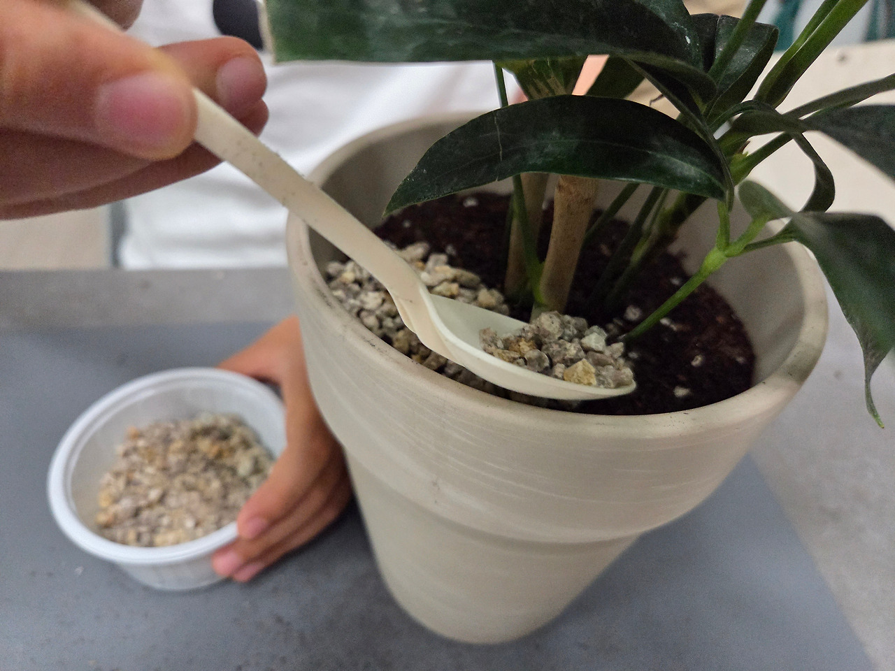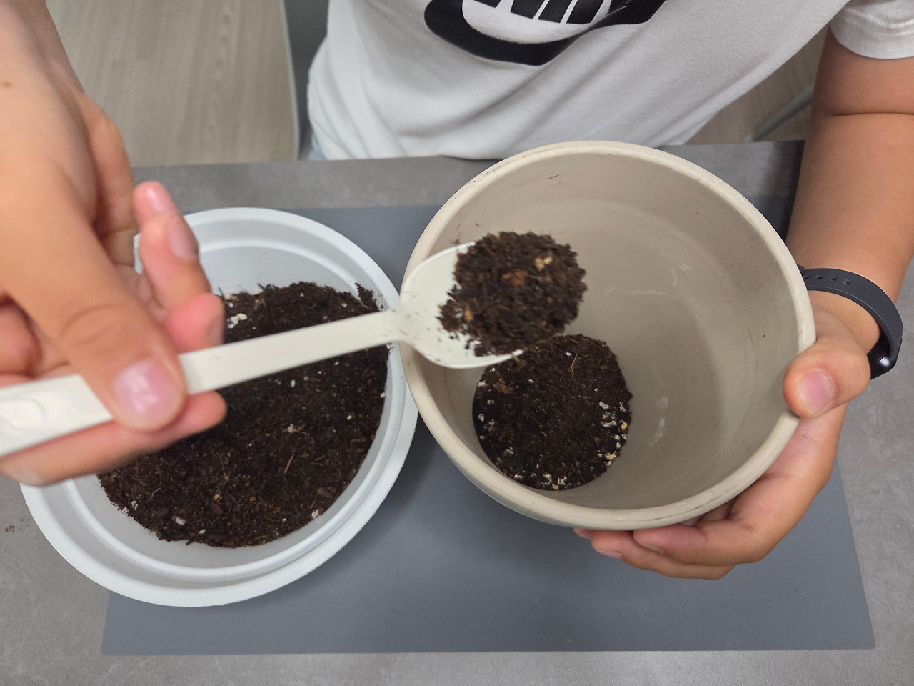 - 숟가락 뒷면으로 꾹꾹 눌러가며 흙을 충분히 채워주세요.