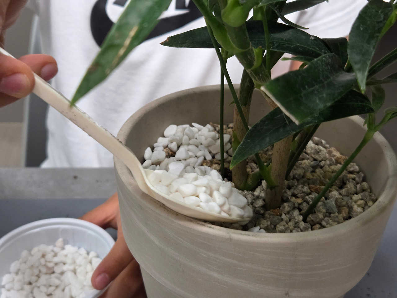 - 식물이 잘 고정될 수 있게 남은 마사토로 흙 위에 덮어주세요.- 마사토 위에 흰돌을 깔아주면 좀 더 깔끔한 느낌이 들어요. (마사토로 마무리를 하게되면 네츄럴한 느낌을 받을 수 있어요.)