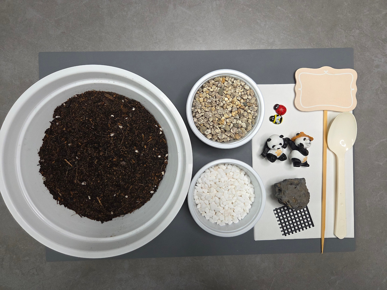 - 준비물 : 배양토, 마사토, 흰돌, 깔망, 종이(물에 잘 녹는 종이), 메모픽, 피규어, 숟가락