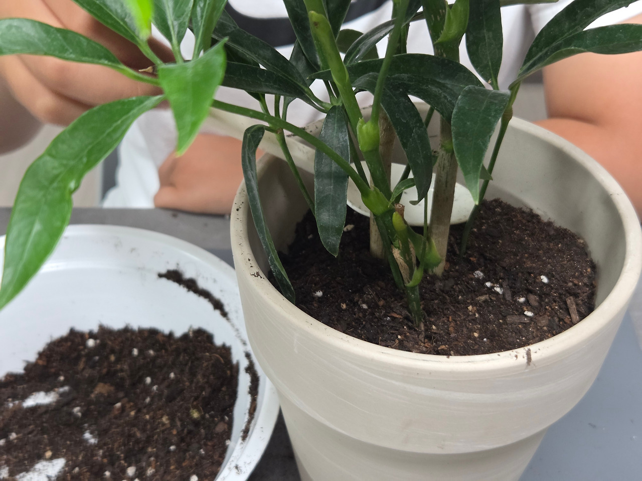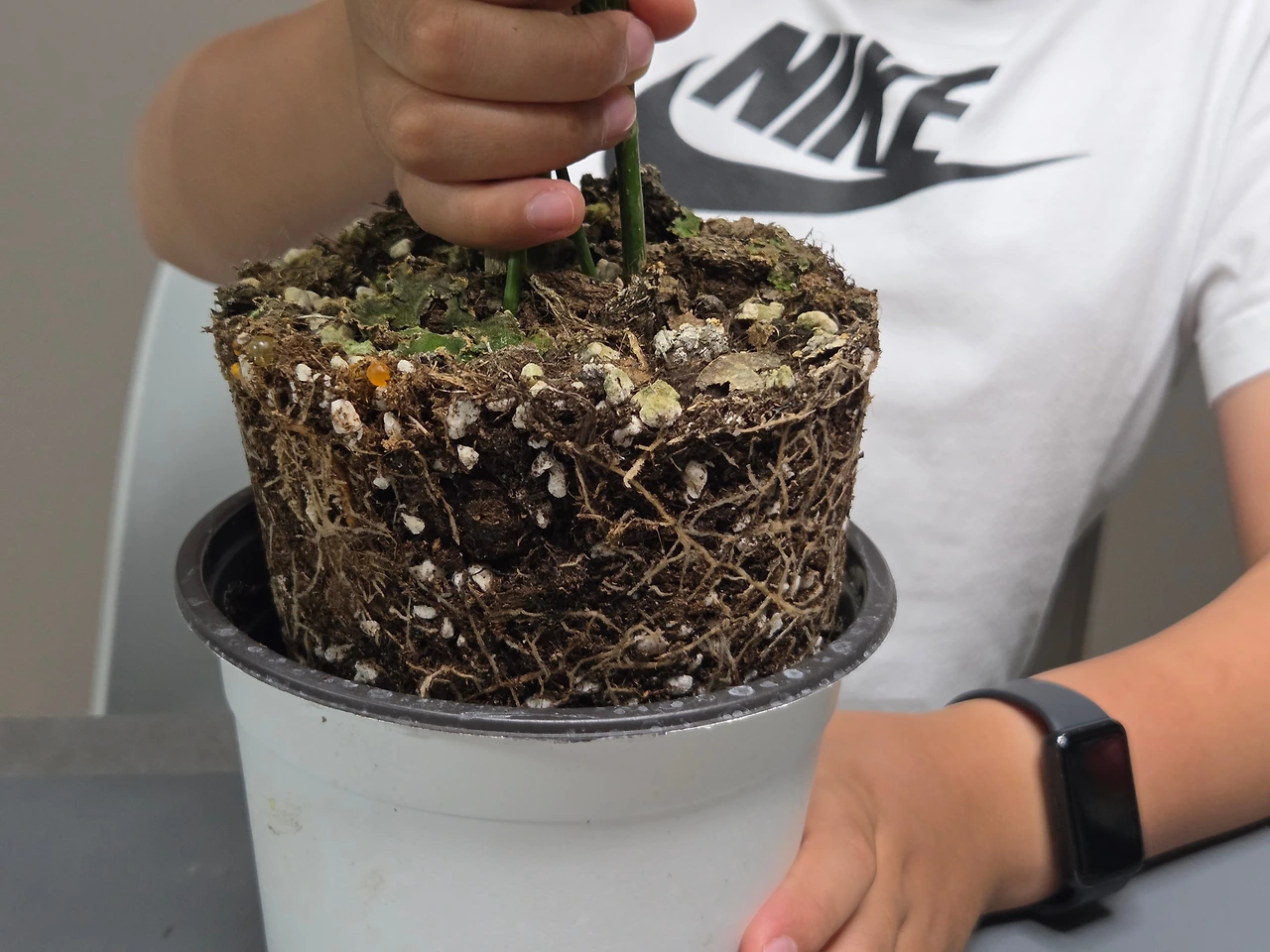 - 포트를 조물조물 눌러준 후에 살살살 줄기를 잡고 꺼내면 식물이 쏘옥 빠져요. (식물의 뿌리를 보는 재미도 있으니 아이 와 이야기을 나누는 것도 좋아요.)