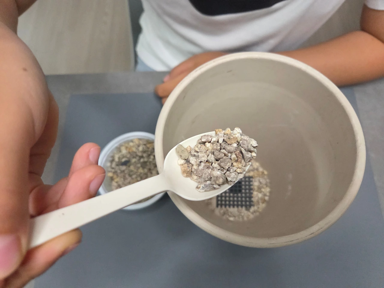 - 마사토 위에 흙을 넣어주세요.(식물이 화분에 심어졌을 때의 높이를 생각하며 흙을 넣어주세요.)