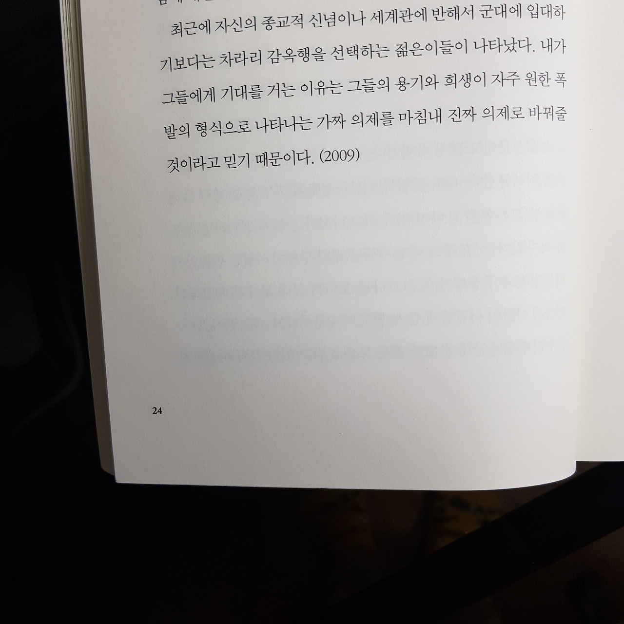 《최근에 자신의 종교적 신념이나 세계관에 반해서 군대에 입대하기보다는 차라리 감옥행을 선택하는 젊은이들이 나타났다. 내가 그들에게 기대를 거는 이유는 그들의 용기와 희생이 원한 폭발의 형식으로 나타나는 가짜 의제를 마침내 진짜 의제로 바꿔줄 것이라고 믿기 때문이다》