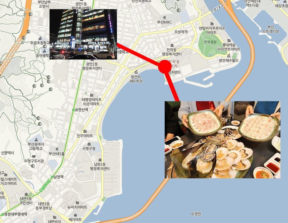 광안리 좌측은 먹거리다. 세계 최대를 자랑하는 회센터를 시작으로 다양한 레스토랑과 카페가 위치한다. 이 뒤로 부산 여름의 메카 '민락수변공원'이 시작된다.