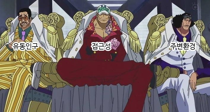 상권에 가장 큰 영향을 미치는 삼대장은 유동인구, 접근성, 주변 환경이다.