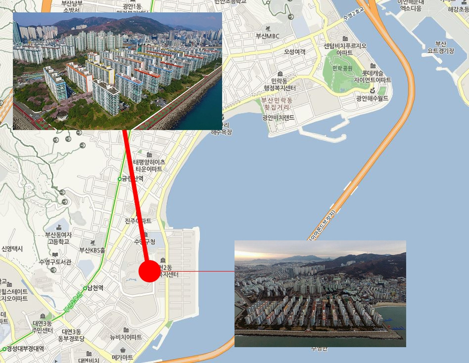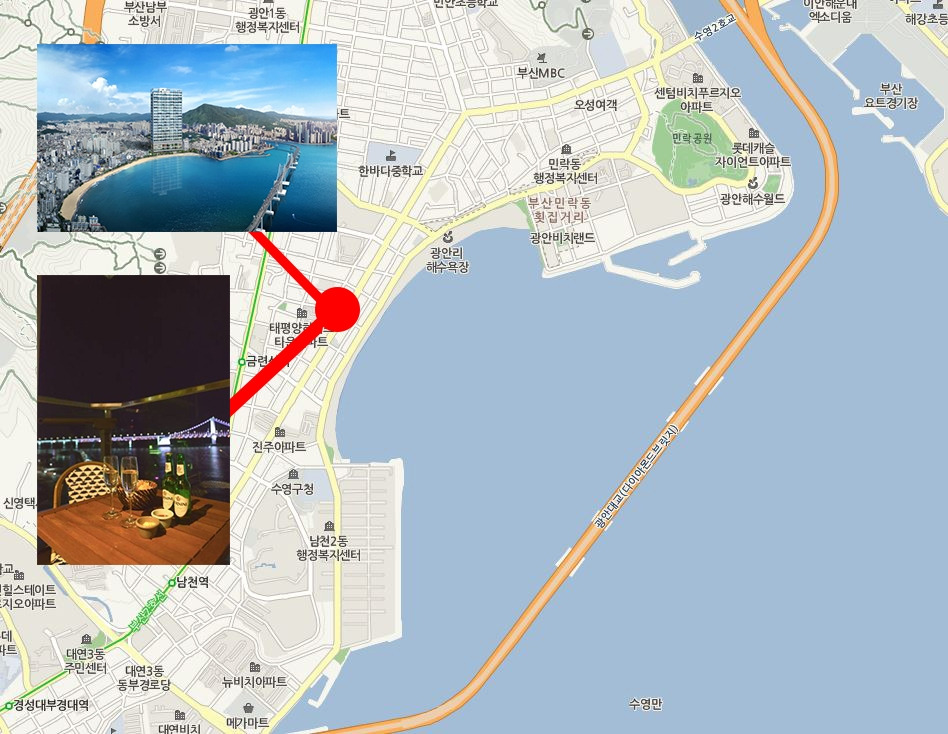 접근성은 어떨까. 광안리 해변 전체가 지하철과 거리가 있는 편이다. 해운대는 구남로 공사를 통해 지하철역과 바다가 직선으로 이어지는 구조를 획득했지만 광안리는 예부터 주거지역이 밀집된 곳이었기에 메인 도로에 지하철이 위치할 수밖에 없었다. 하지만 버스라면 조금 얘기가 달라진다. 1차선 해변도로까지 버스는 들어오지 못하지만 우리 공간은 민락동 시작 지점에 있기에 210번 버스 정류장이 4분 거리에 위치한다. 하지만 버스에는 배차간격이라는 함정이 숨어있지. 평균 10분의 배차간격을 보유한 210번 버스이기에 그렇게 큰 위로는 되지 못한다.
