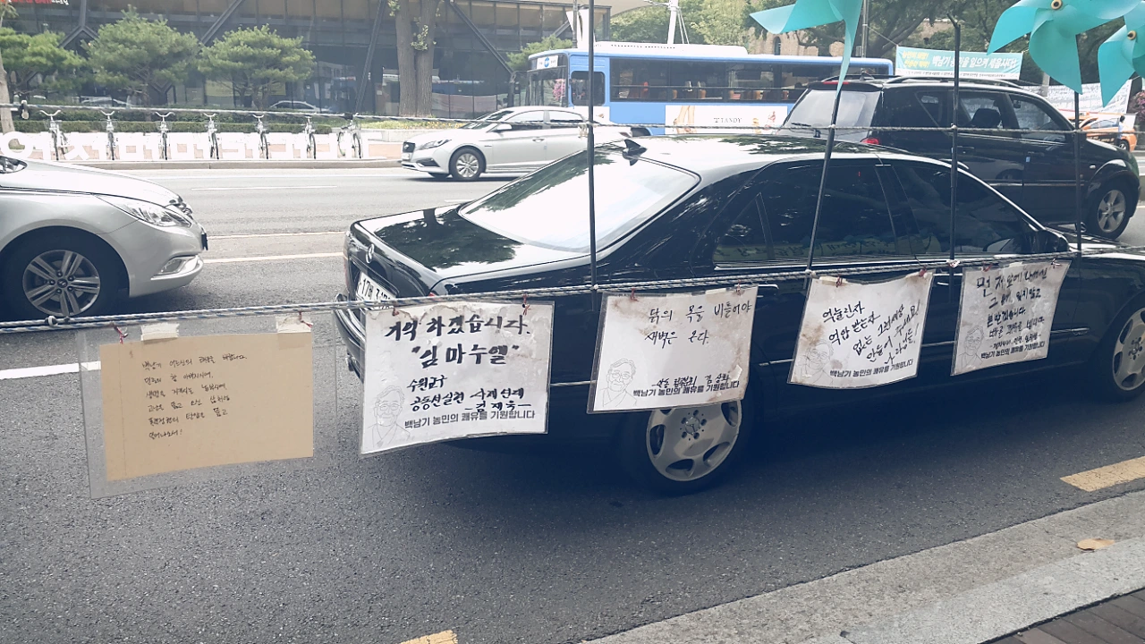 민중총궐기때 경찰의 살수차는 직사로 물을 쏘아댔고. 그 물에 백남기 농민께선 쓰러져 의식을 잃으셨습니다.