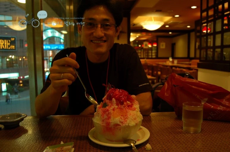 아까 길을 헤매다가 봐 두었던 빙수 가게로 갔다. 부산항에서 가져왔던 우리말로 된 큐슈 안내 책자에도 나와 있던 집이라서 가보기로 했었다. 여기도 역시 젊은 총각만 있었다.