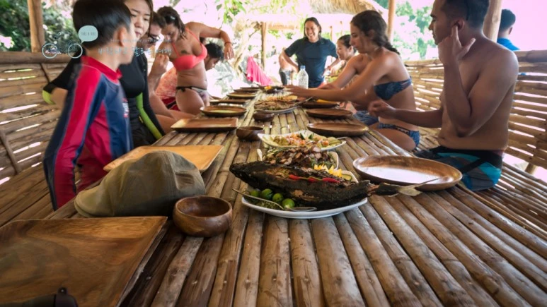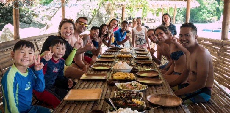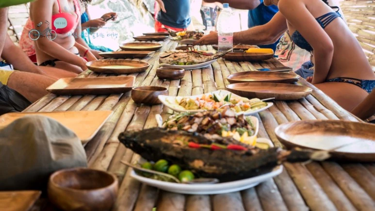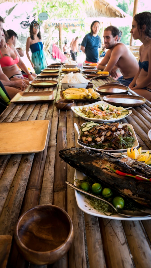 식당은 없다. 대부분 우리처럼 호핑 투어 중인 승객들이고 각 배들은 하루치 음식과 물을 모두 싣고와서 플레이팅만 해서 내 놓았다. 따뜻하게 먹어야 할 구이류는 이 섬까지 오는 동안 배 뒤쪽에서 하얀 연기를 날리면서 구웠고...