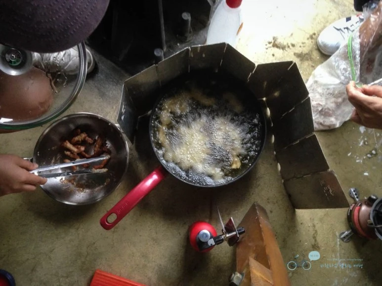 화력 좋은 휘발유 버너에 금새 기름이 끓기 시작하고, 준비한 돼지고기가 튀김 옷을 입고는 풍덩~