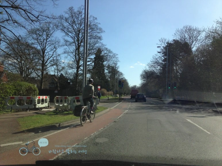 저렇게 차도 옆으로 따로 자전거 도로가 만들어져 있다. 런던의 경우와는 또 달라서 한 컷 담아봤다. 자전거 도로는 교행으로 설치되어 있지는 않았다. 중간에 완충 지대를 두고 반대 방향으로 다니도록 되어있다. 저렇게 하지 않으면 충돌 사고의 우려가 있기 때문이다.