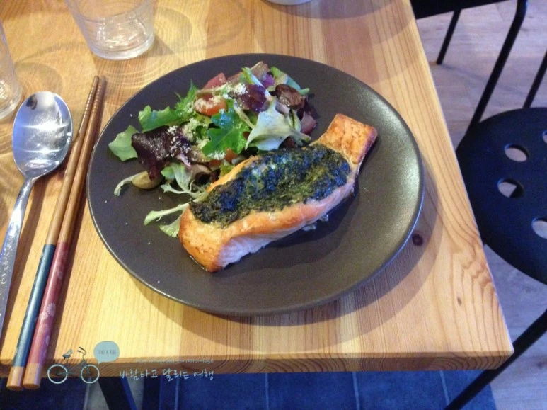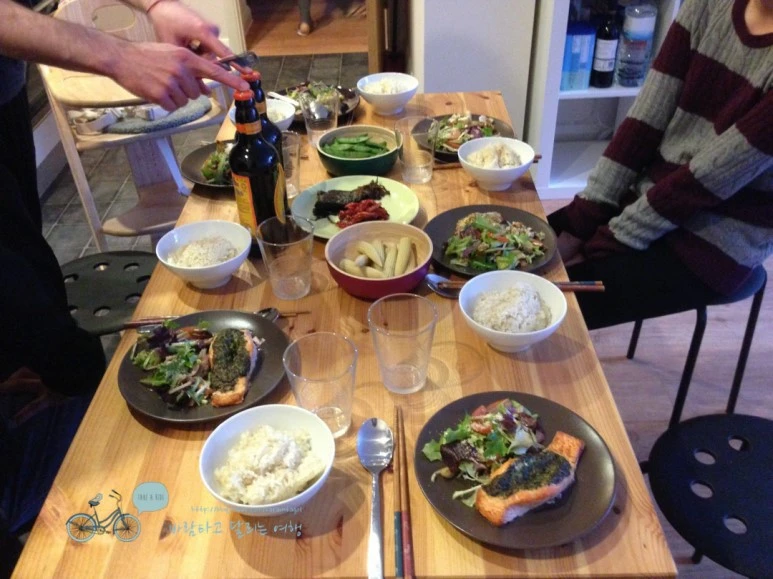 간만에 정갈한 밥과 장아찌, 그리고 처음 맛보는 연어 스테이크로 모두들 포만감 가득 느끼도록 먹고 수다 떨 수 있었다.