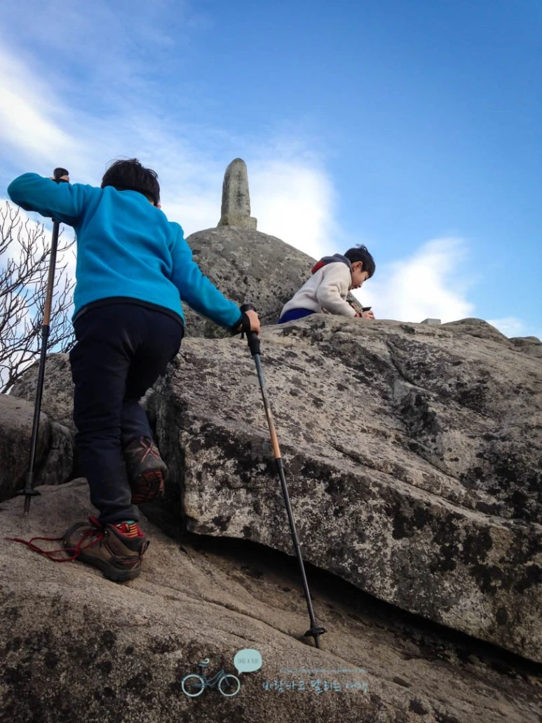 지친 아빠보다 더 잘 오른다. 바위가 여러 층위로 뒤섞인 곳 정상에 작은 표지석이 목표다.