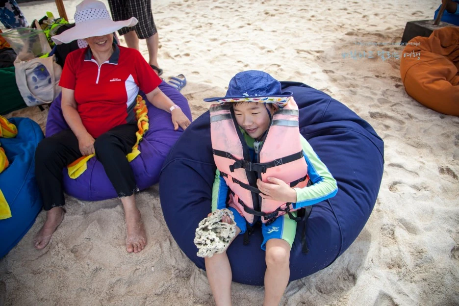 점심 식사가 준비되는 렘봉안 섬 식당 앞 바닷가에 부서지는 햇살을 받으며 다들 패들보트를 타러 떠나는 동안, 체력 방전된 '조손' 두 사람은 잠시 휴식~