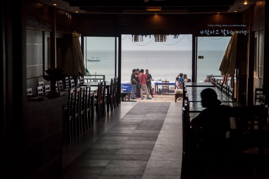 좁은 가게로 들어서면 약간 어두운 실내에 테이블이 가득하고 반대쪽 문은 모래사장으로 이어진다.