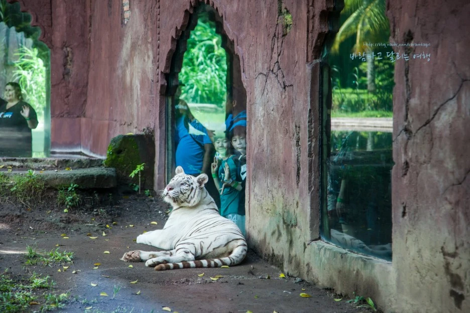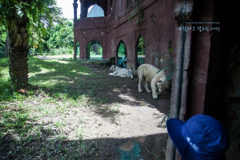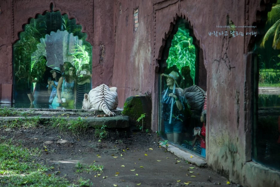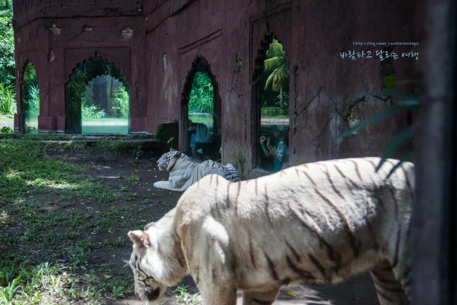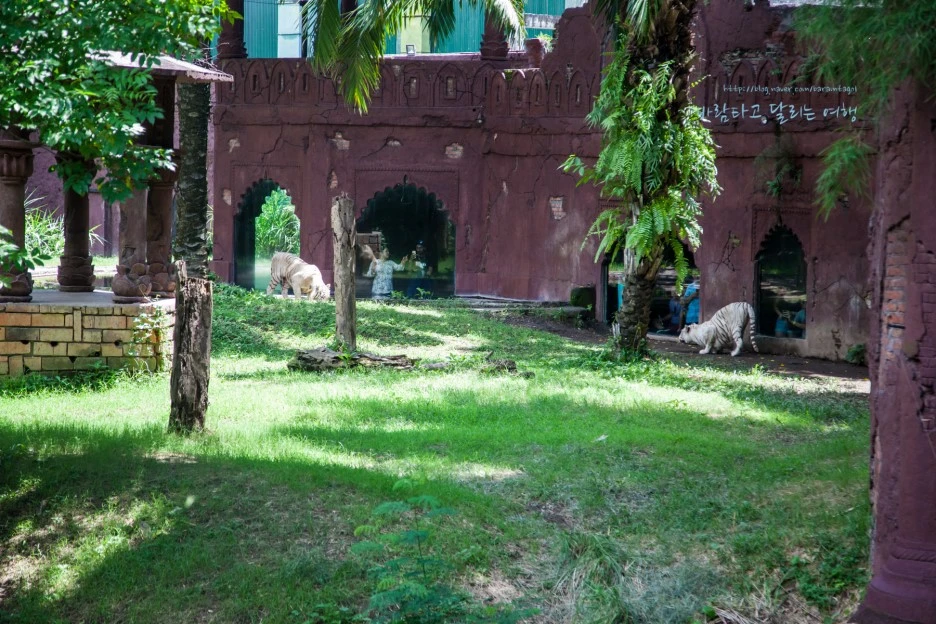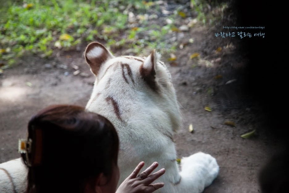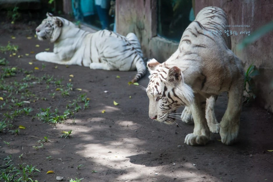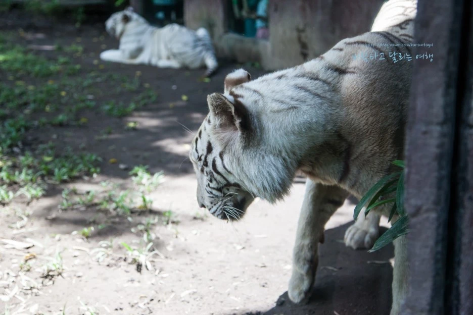 이곳 백호들은 제법 넓은 영역에서 자유롭게 햇볕을 쬐지만 구경하는 사람들은 좁은 건물 안으로 들어가 창문으로 그들을 만난다. 물론 호랑이들에게 이 정도의 영역으로는 자연스럽지 않겠지만, 좁은 우리에 갇힌 그들을 인간이 사방에서 에워싸는 방식과는 달라서 맘에 든다.