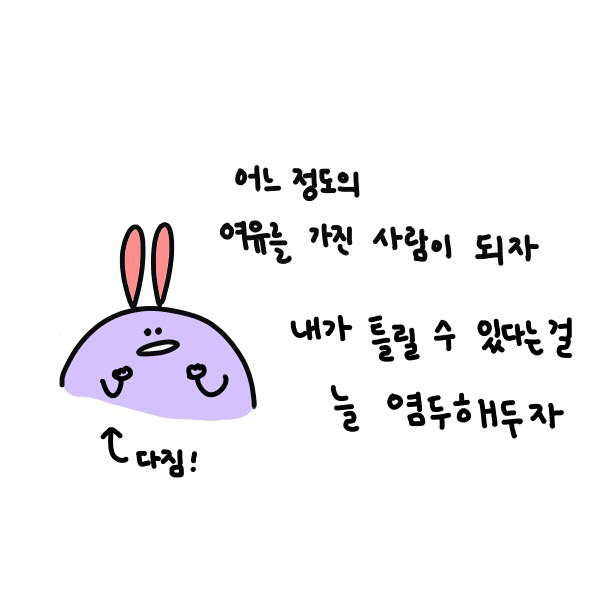 늘 여유를 가지고 상대를 대하자. 내가 틀릴 수 있다는 것을 언제나 마음 속에 새기며. 우리는 각각 다르고 그래서 상대는 그럴 수도 있다는 걸. 오해보다는 이해를!