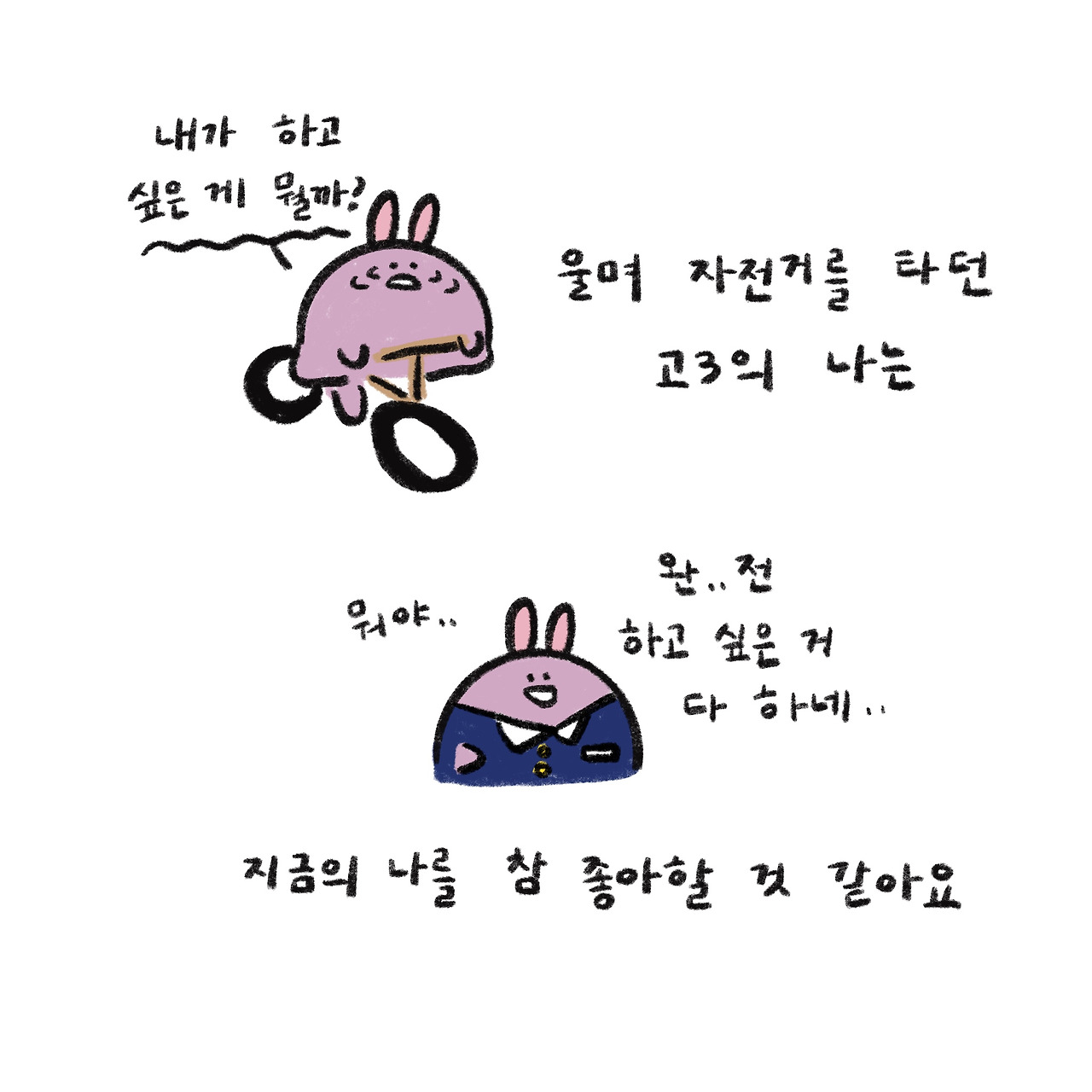 어린 내가 마음에 들어하는 내가 되고 싶다. 순수하던 그 시절의 내가 지금의 내 모습을 보게 된다면, 환히 웃고 있었으면 좋겠다. 생각보다 더 멋진 사람이 되었구나 하면서 기뻐해 줬으면 좋겠다.