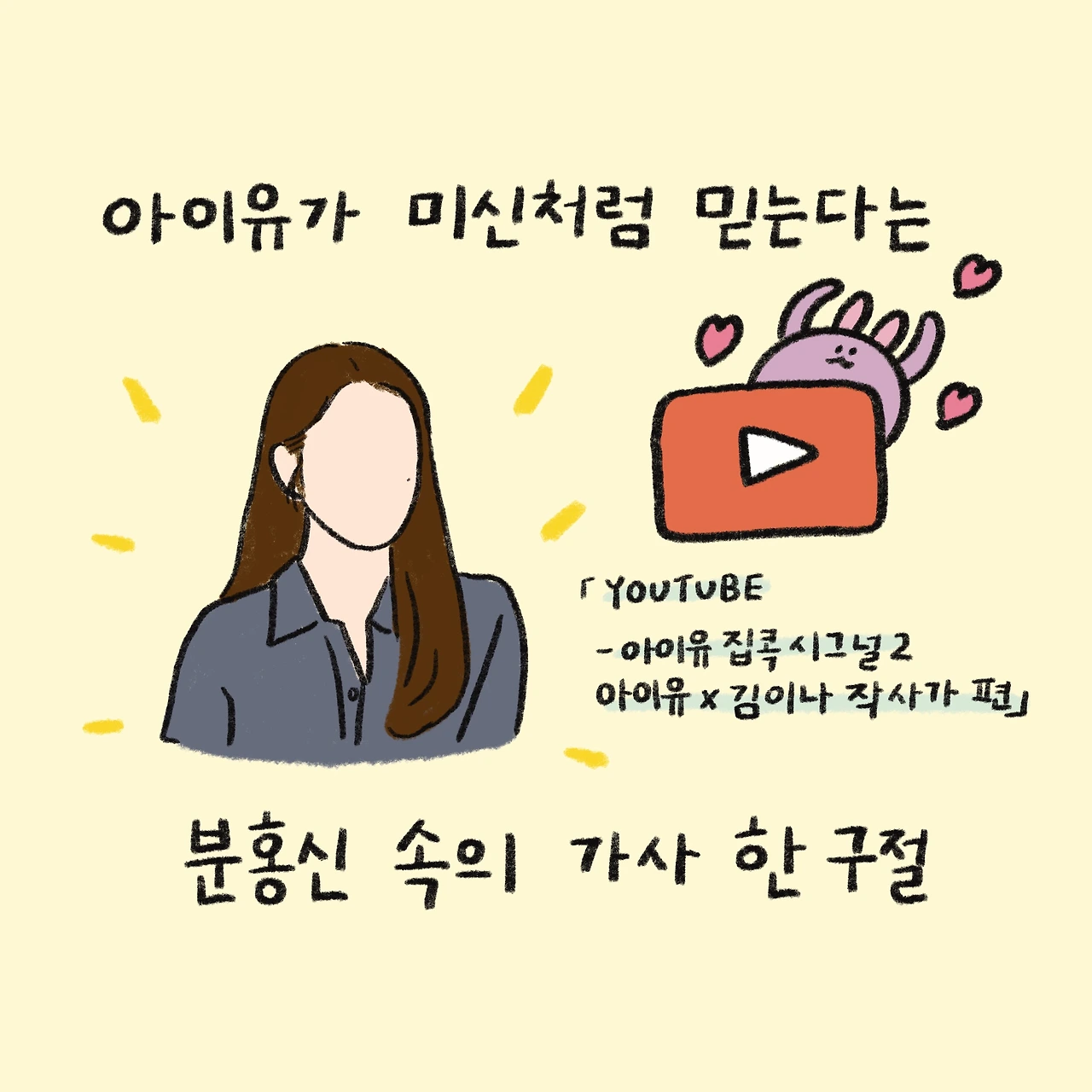 무료하게 일상을 보내던 중 가장 애정하는 가수 아이유의 유튜브 채널 '집콕 시그널'에서 김이나 작사가와 함께 이야기를 나눈다는 소식을 들었다. 개인적으로 이 두 사람은 나에게 영감을 많이 주는 사람들이기에 한껏 기대를 품고 달려갔다. 아니나 다를까, 섬세하고 배려가 담긴 그렇지만 또 생각할 거리들이 가득한 이야기를 그들은 나눴다.