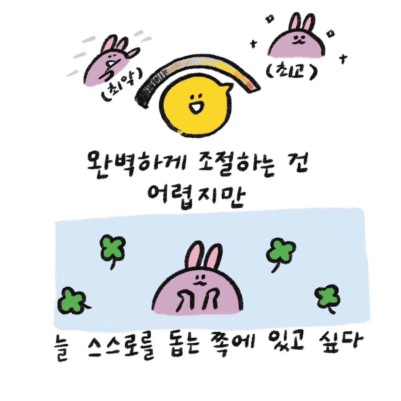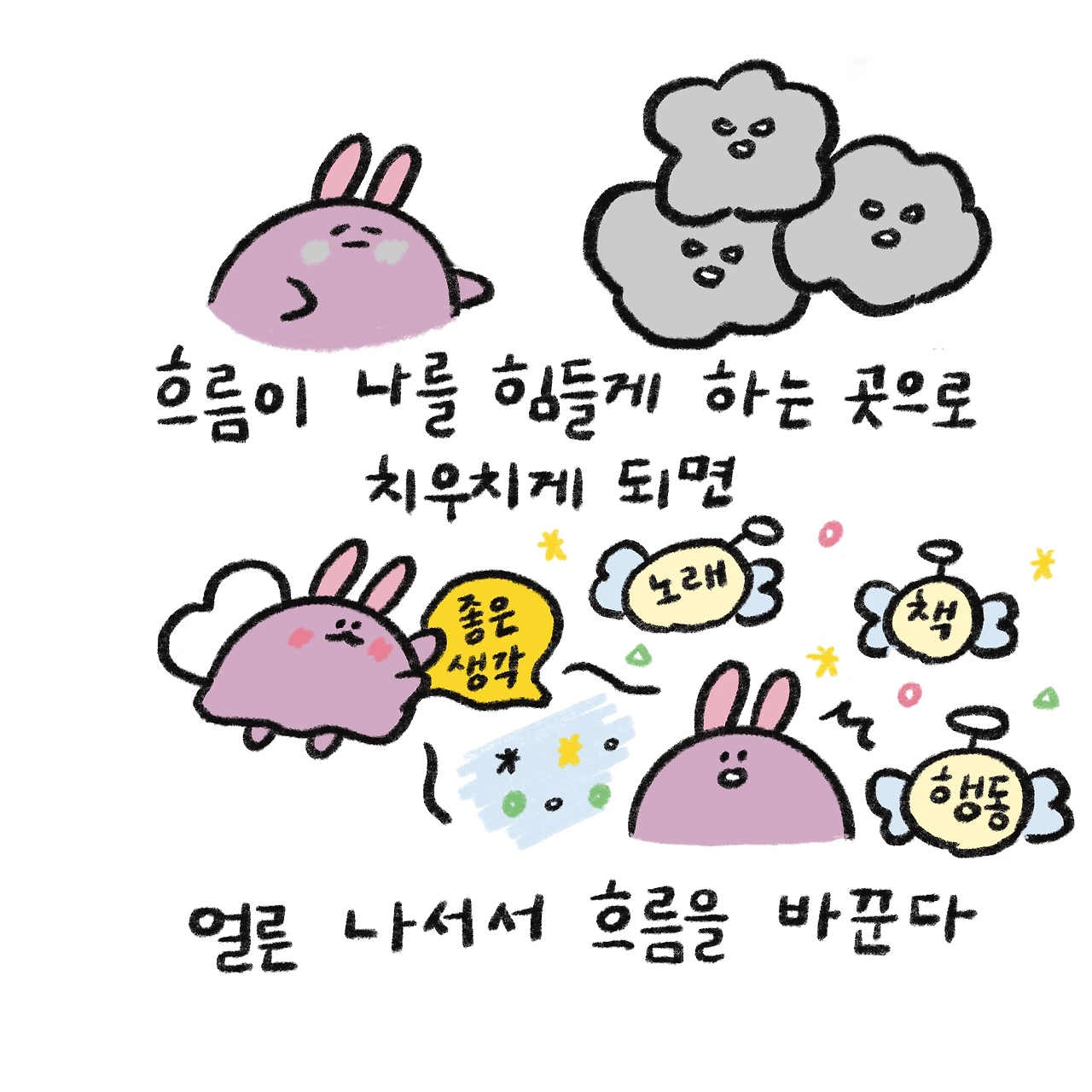 부정적인 생각이 오래 지속될 때면 흐름을 바꾸려고 노력하곤 한다. 밝은 노래를 부른다던지, 생각을 바꿔줄 책을 읽는다던지, 아니면 그저 행동하여 그 생각들을 없앤다던지. 늘 스스로를 좋은 에너지에서 머물게 하고 싶은 마음이다. 그렇게 해서 내가 나를 도울 수 있는 그런 사람이 되고 싶다.