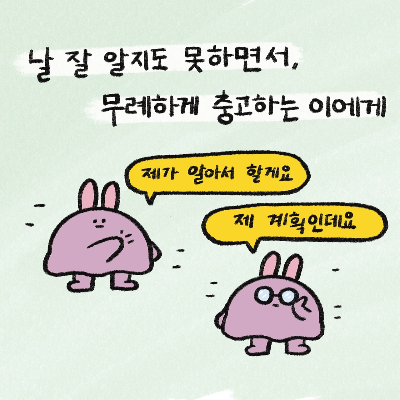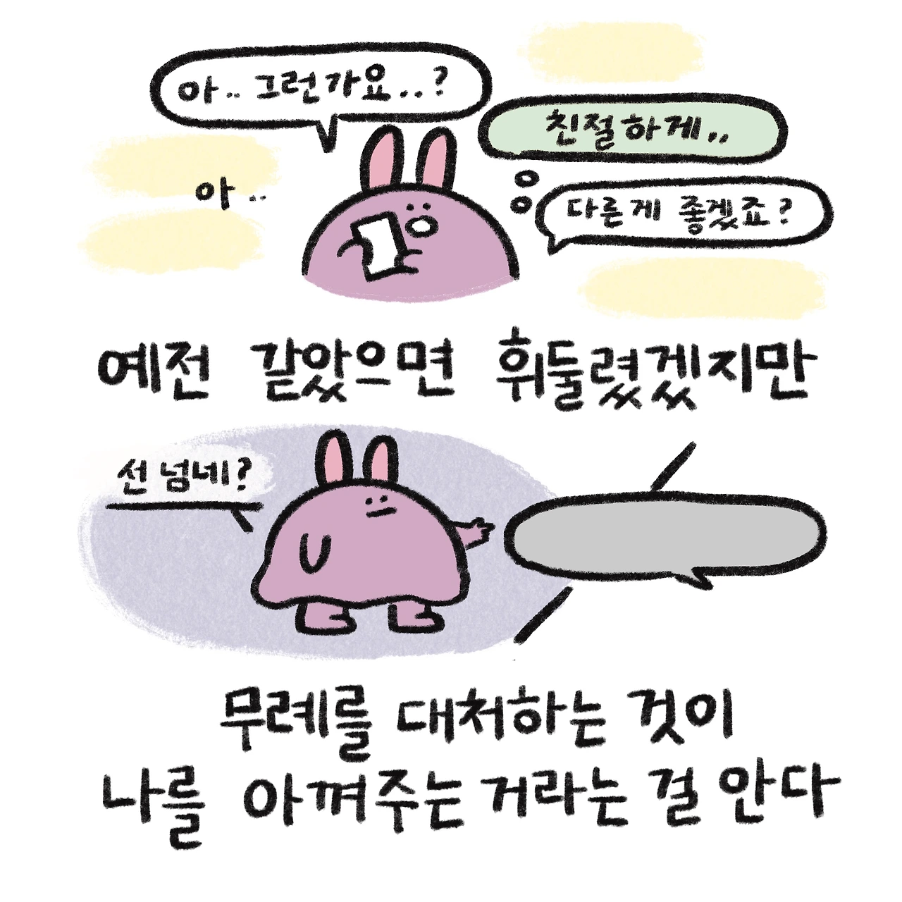 상대가 원하지 않는 충고와 참견이 계속되면 그건 무례한 일이다. 그런 상황에서 좋은 사람으로 남고 싶어 좋게 넘어간다면 난 언제나 그런 취급을 받으며 살게 된다. 무례는 바로 알고 끊어내는 것이 필요하다. 그게 나를 아껴주는 것이고 내 중심을 제대로 잡는 방법이니까 말이다.