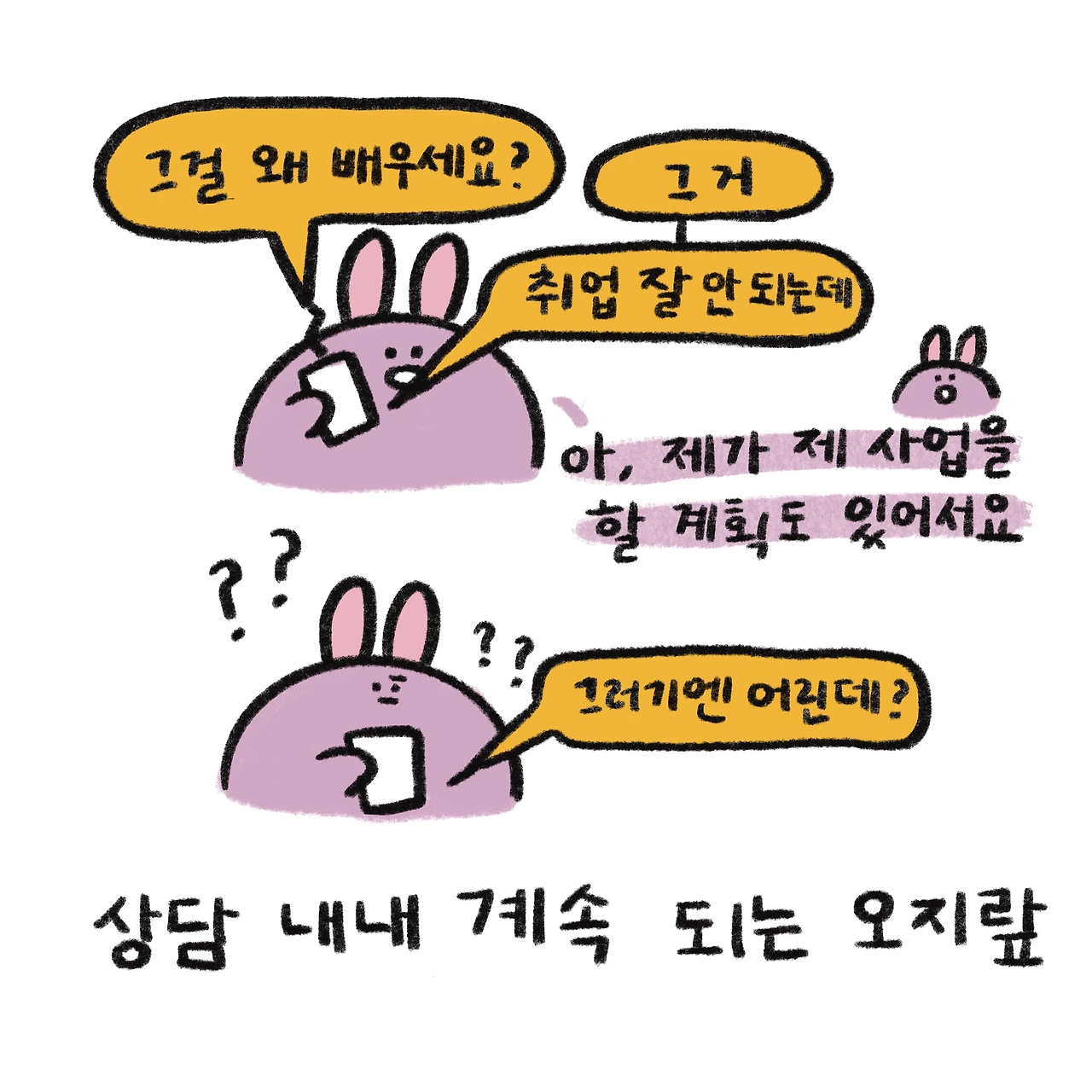 "그건 취업이 안되는데 왜 배우세요?", "그거 말고 웹디자인 배우세요.", 내 사업을 할 수 있다는 말에 "그러기엔 어린데?" 연속되는 기분 나쁜 말에 이건 아니다 싶어서 말했다.