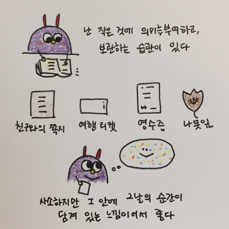 나는 예전부터 물건을 잘 버리지 못하는 버릇이 있다. 내가 정리를 잘 못하는 편이기도 하지만 항상 그 물건에는 그 날이 담겨져 있다는 생각에 쉽사리 버릴 수 없었다. 비록 종이 한 장 이더라도 그것에 나의 추억이 담겨 있다면 괜히 더 소중했다.