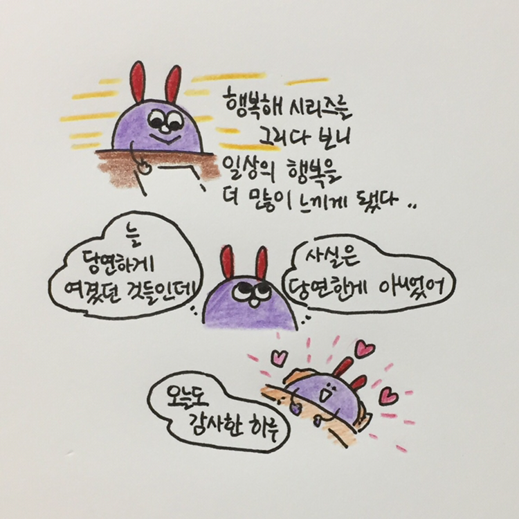 감사함을 자주 느낄 수 있어서 행복하다. 그림을 그리는 일이 나에게 늘 좋은 영향을 주는 것 같아서 행복하다. 내 그림이 또다른 사람들에게 힘과 위로가 되어 행복하다. 이런 나를 응원해주는 사람이 있어서 행복하다. 내일이 기대 되는 매일을 살고 있어서 행복하고 감사하다.