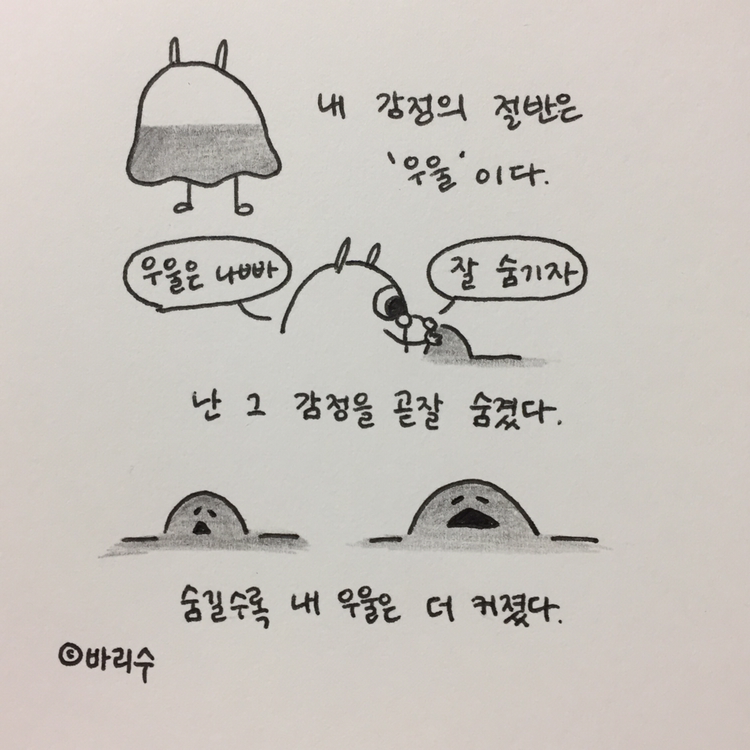 나는 항상 나를 규정하려고 한다. 나는 어떤 사람 인지. 나는 내가 밝고 긍정적인 사람이었으면 싶었다. 그래서 우울이라는 감정이 생길 때 마다 그 감정은 나쁜 감정이라고 여기고 숨겨왔다. 우울할 땐 더 즐거운 척을 했다. 그러면 우울이 사라질거라고 믿었다. 하지만 되려 우울은 숨길 수 없이 커졌다.