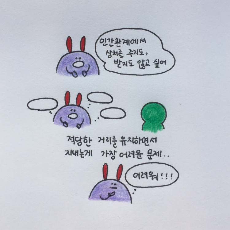 인간관계에서 상처를 주지도 받지도 않고 싶다면 아무도 만나지 말아야 한다. 그래서 한때 그저 집에만 있었다. 누군가를 만나는 일이 너무 힘들게만 느껴졌다. 특히 내 자신을 너무 미워했던 탓에 작은 한마디에도 큰 상처를 받았다. 하지만 아무도 만나지 않는다고 해서 나아지는건 없었다.