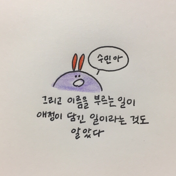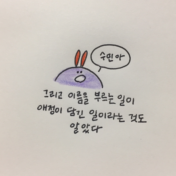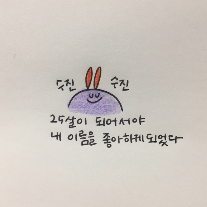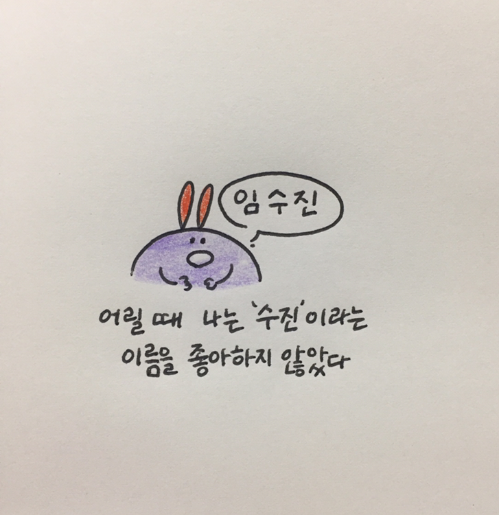 난 내 이름을 안 좋아했다. 수진. 너무 흔했다. 흔하지 않은 이름을 가진 친구들은 사람들이 잘 기억해주던데 내 이름은 너무 흔해서, 그리고 그 이름을 뛰어 넘을 만큼 내가 특별하지 않아서 까먹는다고 믿었다. 그래서 내가 금방 까먹게 되는 존재라고 느꼈던 것 같다. 지금은 내 이름이 너무너무 좋지만 나를 찾기까지 나는 이렇게 느꼈다. 난 특별하지 않다. 평범하다. 그래서 다들 금방 나를 잊는다. 하고.