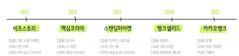 연봉, 회사 규모, 복지, 자아실현 등. 어느 면으로 보아도 나는 확실히 상승 곡선의 커리어 패스를 그리는 중이다. 타임라인으로 그려보면 다음과 같다.