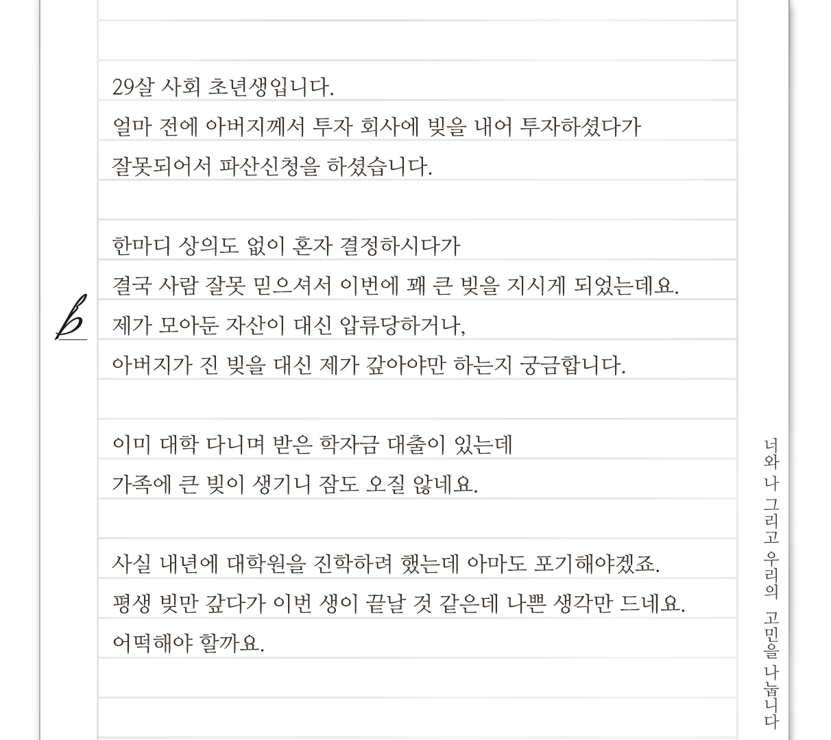 생활비 혹은 학자금으로 빚을 지더라도 절대 꿈과 희망을 저버리지는 맙시다. 그것마저 포기하면 우리에게 남는 게 없으니까요. 원리금 균등상환으로 이자만 내서 대학원에 일단 진학하길 바랍니다. 돌이켜보면 삶을 변화시키려면 거주지를 옮기거나, 시간을 달리 쓰거나, 새로운 사람을 만나는 방법밖에 없었습니다. 삶에서 후회를 만들지 말고 기회를 창출하면서 쳇바퀴 도는 삶에서 어제보다 더 나은 오늘만을 생각하고, 그리며 버티시길 바랍니다.
