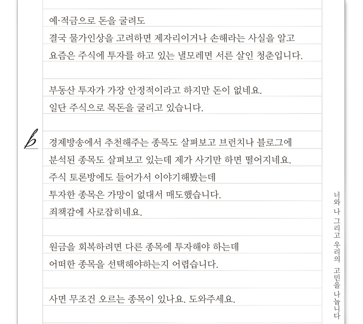 우리가 살아온 삶 역시 청춘 스스로 선택으로 만들어졌고 앞으로의 삶 역시 그러합니다. 미래가 정해지지 않은 우리 청춘처럼 미래 어느 시점에 무조건 주가가 오르는 종목은 없습니다. 오르리라 기대할 뿐이죠. 그러니 투자사 대표가 강사로 활동하는 경제방송이나 블로그에 작성된 종목을 신뢰하지 마세요.
