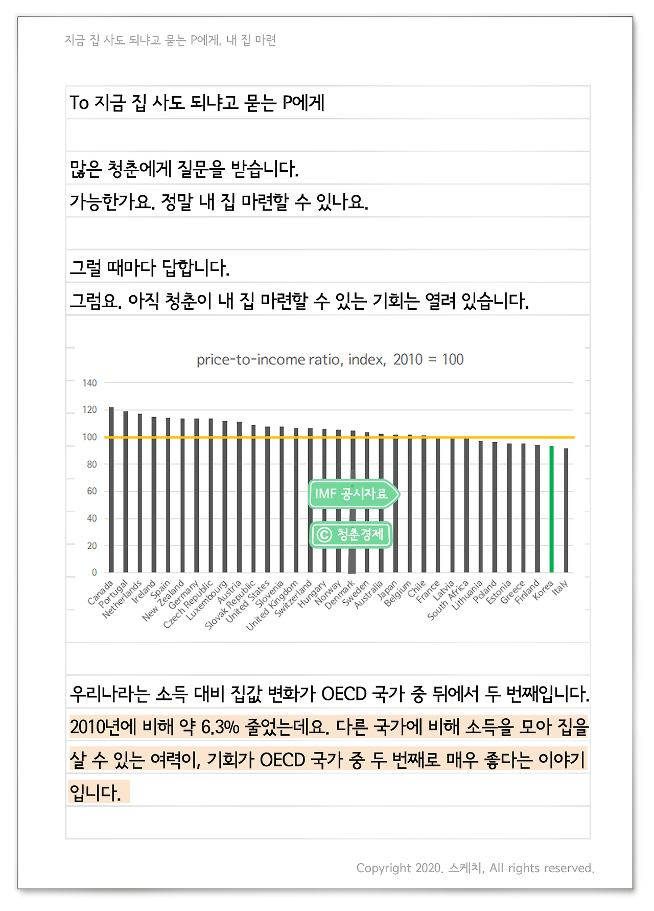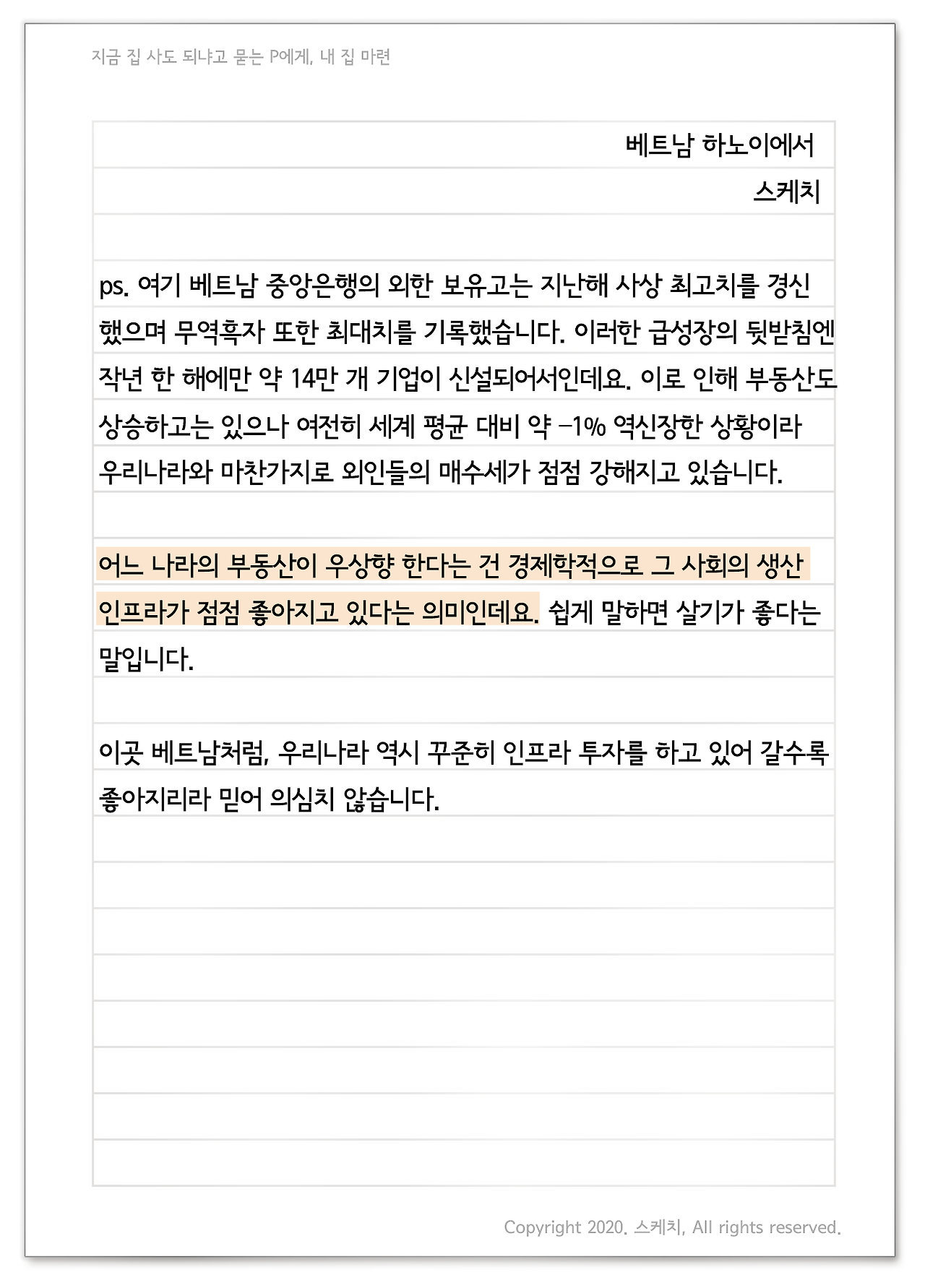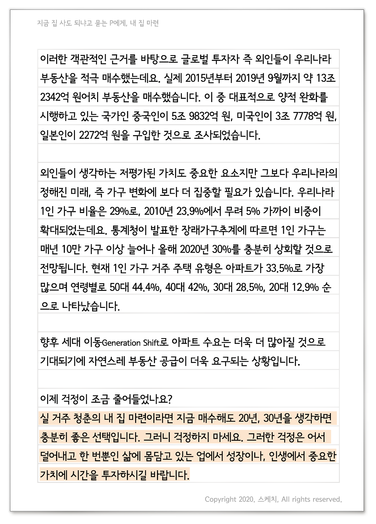 많은 청춘에게 질문을 받습니다. 가능한가요. 정말 내 집 마련할 수 있나요. 그럴 때마다 답합니다. 그럼요. 아직 청춘이 내 집 마련할 수 있는 기회는 열려 있습니다. 우리나라는 소득 대비 집값 변화가 OECD 국가 중 뒤에서 두 번째입니다. 2010년에 비해 약 6.3% 줄었는데요. 다른 국가에 비해 소득을 모아 집을살 수 있는 여력이, 기회가 OECD 국가 중 두 번째로 매우 좋다는 이야기입니다. 이러한 객관적인 근거를 바탕으로 글로벌 투자자 즉 외인들이 우리나라 부동산을 적극 매수했는데요. 실제 2015년부터 2019년 9월까지 약 13조2342억 원어치 부동산을 매수했습니다. 이 중 대표적으로 양적 완화를 시행하고 있는 국가인 중국인이 5조 9832억 원, 미국인이 3조 7778억 원, 일본인이 2272억 원을 구입한 것으로 조사되었습니다. 외인들이 생각하는 저평가된 가치도 중요한 요소지만 그보다 우리나라의 정해진 미래, 즉 가구 변화에 보다 더 집중할 필요가 있습니다. 우리나라 1인 가구 비율은 29%로, 2010년 23.9%에서 무려 5% 가까이 비중이 확대되었는데요. 통계청이 발표한 장래가구추계에 따르면 1인 가구는 매년 10만 가구 이상 늘어나 올해 2020년 30%를 충분히 상회할 것으로 전망됩니다. 현재 1인 가구 거주 주택 유형은 아파트가 33.5%로 가장 많으며 연령별로 50대 44.4%, 40대 42%, 30대 28.5%, 20대 12.9% 순으로 나타났습니다.향후 세대 이동Generation Shift로 아파트 수요는 더욱 더 많아질 것으로 기대되기에 자연스레 부동산 공급이 더욱 요구되는 상황입니다. 이제 걱정이 조금 줄어들었나요?실 거주 청춘의 내 집 마련이라면 지금 매수해도 20년, 30년을 생각하면 충분히 좋은 선택입니다. 그러니 걱정하지 마세요. 그러한 걱정은 어서 덜어내고 한 번뿐인 삶에 몸담고 있는 업에서 성장이나, 인생에서 중요한 가치에 시간을 투자하시길 바랍니다. 베트남 하노이에서 스케치