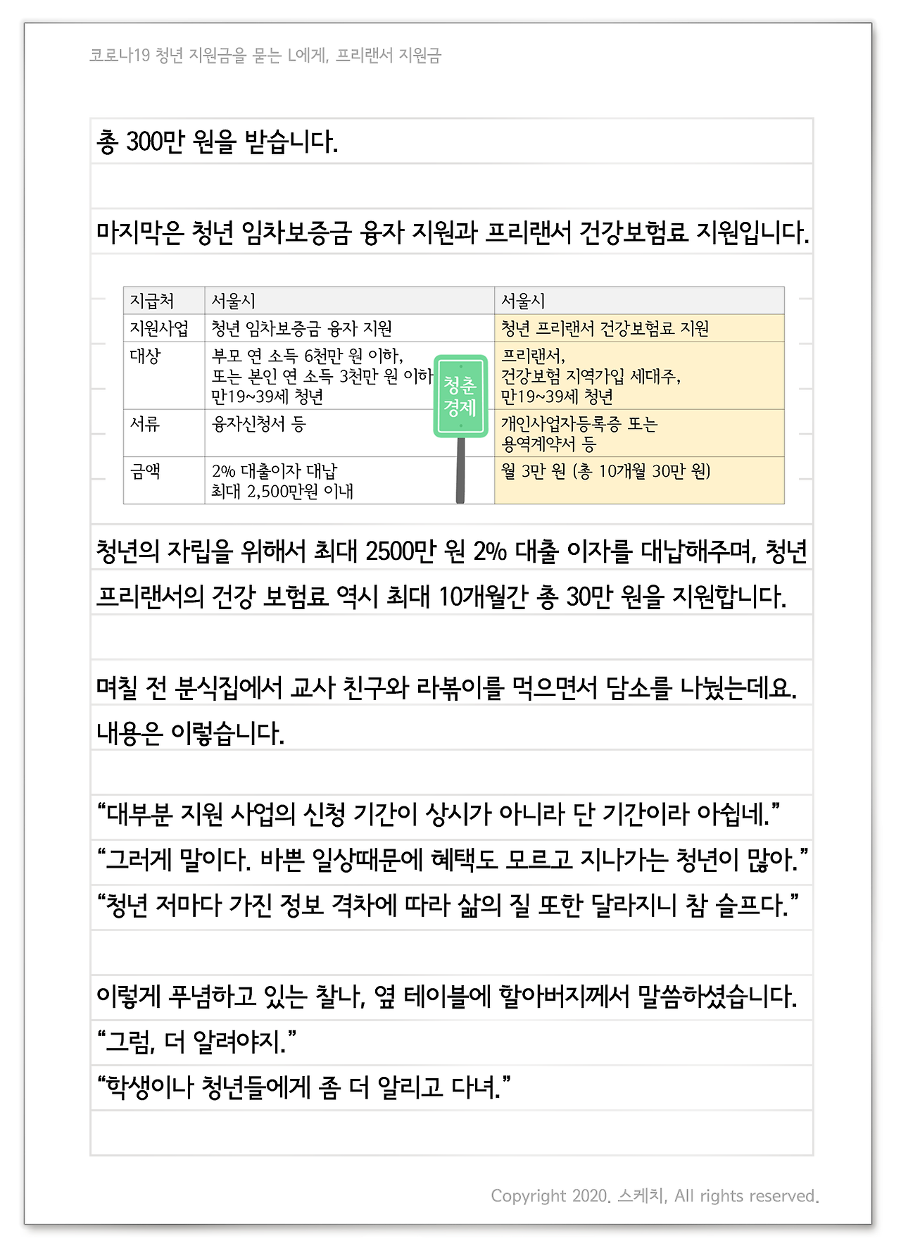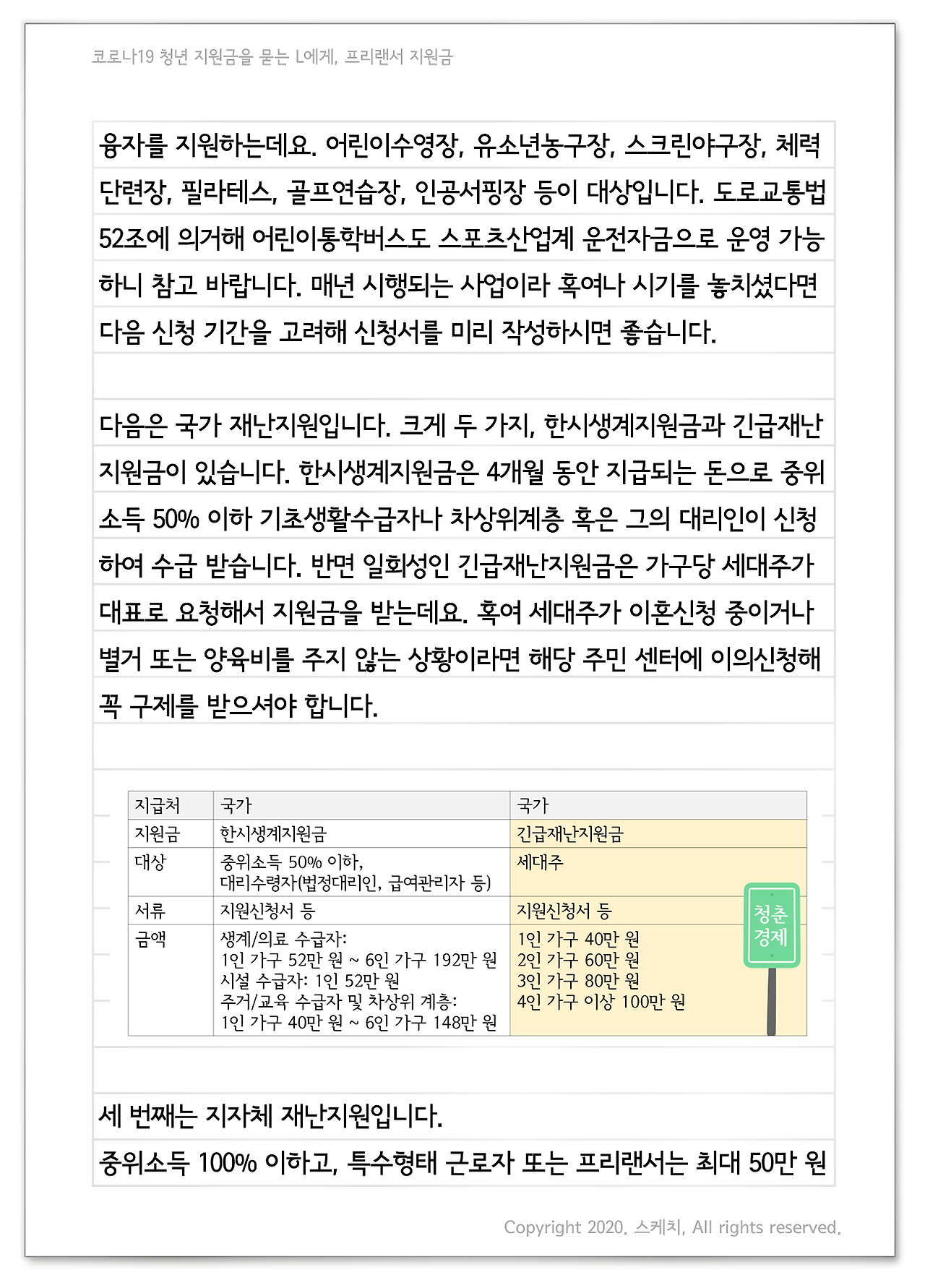 사회적 거리두기의 일환으로 헬스장 운영이 한시적으로 중단되었습니다. 많은 체육 시설이 동참해 주신 덕분에 확진자 수는 빠르게 감소하였고, 어느덧 생활 속 거리 두기로 완화 단계까지 오게 되었네요. 덕분에 감사합니다! 코로나로 인한 헬스장 운영 중단 및 매출 감소에 대해 운영하는 대표와근로자(트레이너 등)에 대해 몇 가지 지원 대책을 국가와 지자체가 서로발표했는데요. 문의하신 서울특별시 프리랜서 지원금을 포함한 청년 지원사업을 아래와 같이 한번 정리했습니다. 스포츠산업계 청년들의 삶에 도움이 되었으면 좋겠네요.먼저 소개드릴 내용은 헬스장 특별융자 지원입니다. 국민체육진흥기금에 튼튼론이라고 있는데요. 무려 1.5%, 저금리입니다.코로나로 어려움을 겪고 있는 스포츠산업계 피해를 최소화하고자 특별융자를 지원하는데요. 어린이수영장, 유소년농구장, 스크린야구장, 체력단련장, 필라테스, 골프연습장, 인공서핑장 등이 대상입니다. 도로교통법 52조에 의거해 어린이통학버스도 체육시설업체 운전자금으로 운영 가능하니 참고 바랍니다. 매년 시행되는 사업이라 혹여나 시기를 놓치셨다면 다음 신청 기간을 고려해 신청서를 미리 써두시고 지원하시면 좋습니다.다음은 국가 재난지원입니다. 크게 두 가지 한시생계지원금과 긴급재난지원금이 있습니다. 한시생계지원금은 4개월 동안 지급되는 돈으로 중위소득 50% 이하 기초생활수급자나 차상위계층 혹은 그의 대리인이 신청하여 수급 받습니다. 반면 일회성인 긴급재난지원금은 가구당 세대주가 대표로 신청하여 지원금을 받습니다. 따라서 세대주가 이혼신청 중이거나 별거 또는 양육비를 주지 않는 가구라면 해당 주민 센터에 이의신청해서꼭 구제받으시길 바랍니다.세 번째는 지자체 재난지원입니다.중위소득 100% 이하고, 특수형태 근로자 또는 프리랜서는 최대 50만 원 프리랜서 지원금을 받을 수 있습니다. 소득 감소율에 따라 인천시는 25만원에서 50만 원까지 차등 지원하며, 서울시는 일괄 50만 원 지급합니다.이외 고용유지 지원금도 있는데요. 코로나 여파로 업이 중단되었거나, 일부 고용 직원에 대해 무급휴직을 실시한 업체라면 1일 2.5만 원, 최대20일간 4명 근로자의 고용유지 지원금 50만 원을 수급할 수 있습니다. 이 밖에 청년 지원 사업도 있는데요. 알바, 단기 근로를 실직한 청년 또는 졸업 후 2년 경과한 미취업 청년을 대상으로 월 50만 원을 지급합니다. 청년긴급수당은 2개월 간 총 100만 원을 지급하며 청년수당은 6개월간 총 300만 원을 받습니다.마지막은 청년 임차보증금 융자 지원과 프리랜서 건강보험료 지원입니다.청년의 자립을 위해서 최대 2500만 원 2% 대출 이자를 대납해주며, 청년프리랜서의 건강 보험료 역시 최대 10개월간 총 30만 원을 지원합니다.며칠 전 분식집에서 교사 친구와 라볶이를 먹으면서 담소를 나눴는데요.내용은 이렇습니다.“대부분 지원 사업의 신청 기간이 상시가 아니라 단 기간이라 아쉽네.”“그러게 말이다. 바쁜 일상때문에 혜택도 모르고 지나가는 청년이 많아.”“청년 저마다 가진 정보 격차에 따라 삶의 질 또한 달라지니 참 슬프다.”이렇게 푸념하고 있는 찰나, 옆 테이블에 할아버지께서 말씀하셨습니다.“그럼, 더 알려야지.”“학생이나 청년들에게 좀 더 알리고 다녀.” 앞서 열거했듯, 문의하신 프리랜서 지원금 외에도 국가 및 지자체가 추진하는 청년 지원 사업이 많은데요. 헬스장, 필라테스 등 여러 스포츠산업에종사하는 주변 지인들에게도 공유해 정보 격차를 줄여주시면 좋겠습니다. 이대 앞 카페에서, 스케치 드림.ps. 어딘가 내가 모르는 곳에보이지 않는 꽃처럼 웃고 있는너 한 사람으로 하여 세상은다시 한번 눈부신 아침이 되고어딘가 네가 모르는 곳에 보이지 않는 풀잎처럼 숨쉬고 있는나 한 사람으로 하여 세상은 다시 한번 고요한 저녁이 온다나태주, 멀리서 빈다中지원금 수급을 귀찮아하거나, 부끄럽게 생각하지 마세요. 보이지 않는 꽃처럼, 풀입과 같이 피고 성장하는 청년 덕분에 우리 사회는 보다 밝아지고, 더 아름다워지니까요. 사실 지원 사업이 아니라 투자라고볼 수 있습니다. 경제 주체인 청년의 사회 진출을 돕는 대한민국의 투자입니다.
