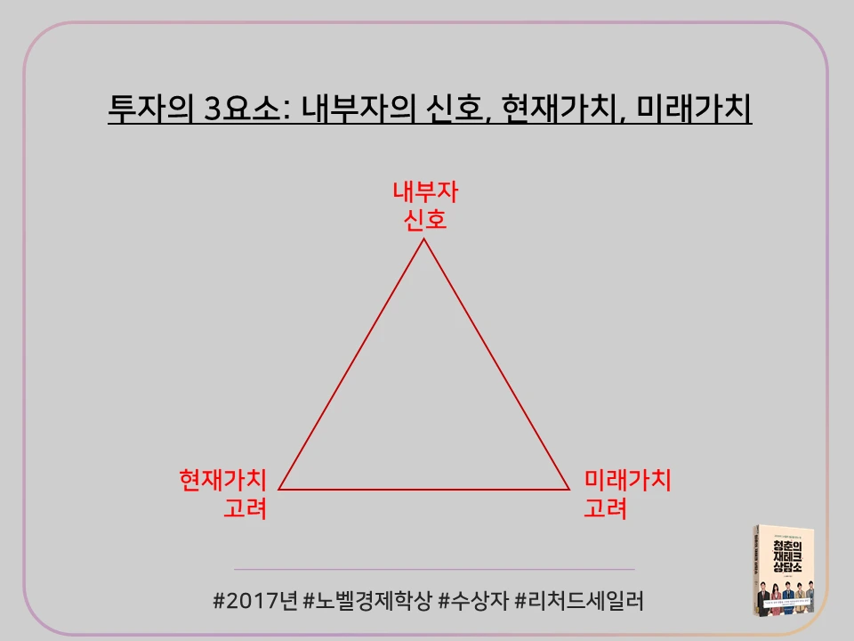 그러면 우린 어떠한 종목에 투자해야 할까요. 주식을 막 시작한 주린이라면 '청춘의 재테크 상담소(한국경제신문출판사, 2019)'에 소개된 투자의 정석을 권합니다. 바로 2017년 노벨경제학상을 수상한 리처드 세일러 교수의 투자의 3요소입니다. 내부자의 신호가 포착된 종목들 중 현재 저평가되어 있는 종목에 투자하는 건데요.