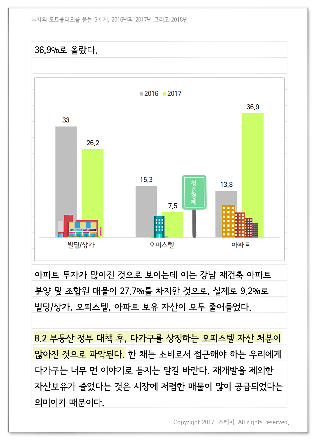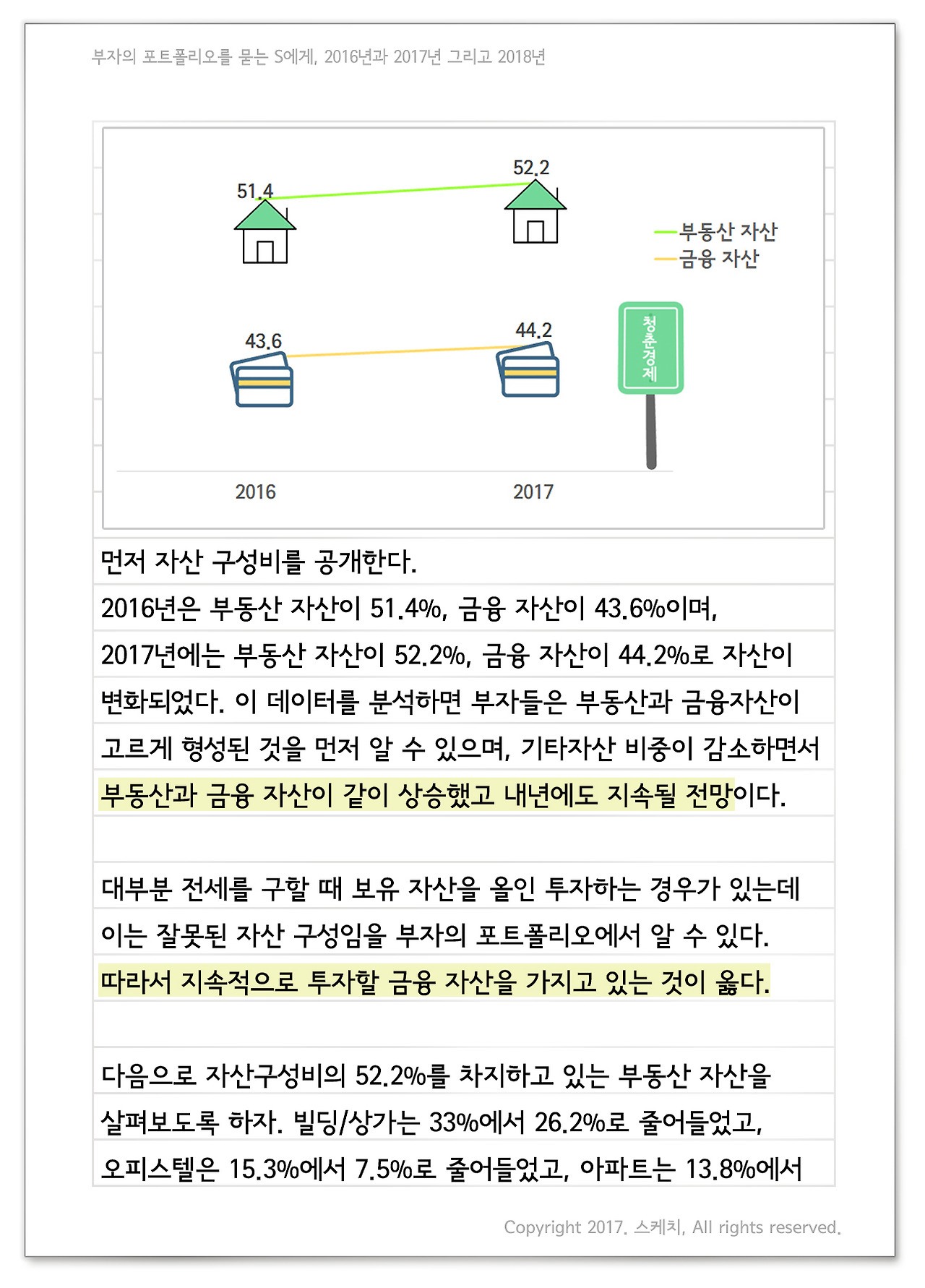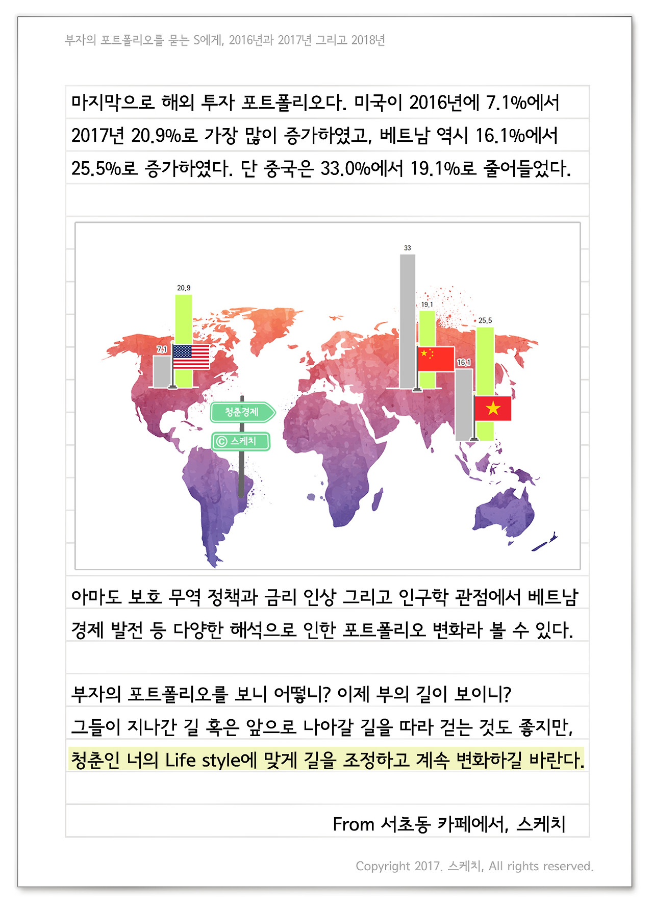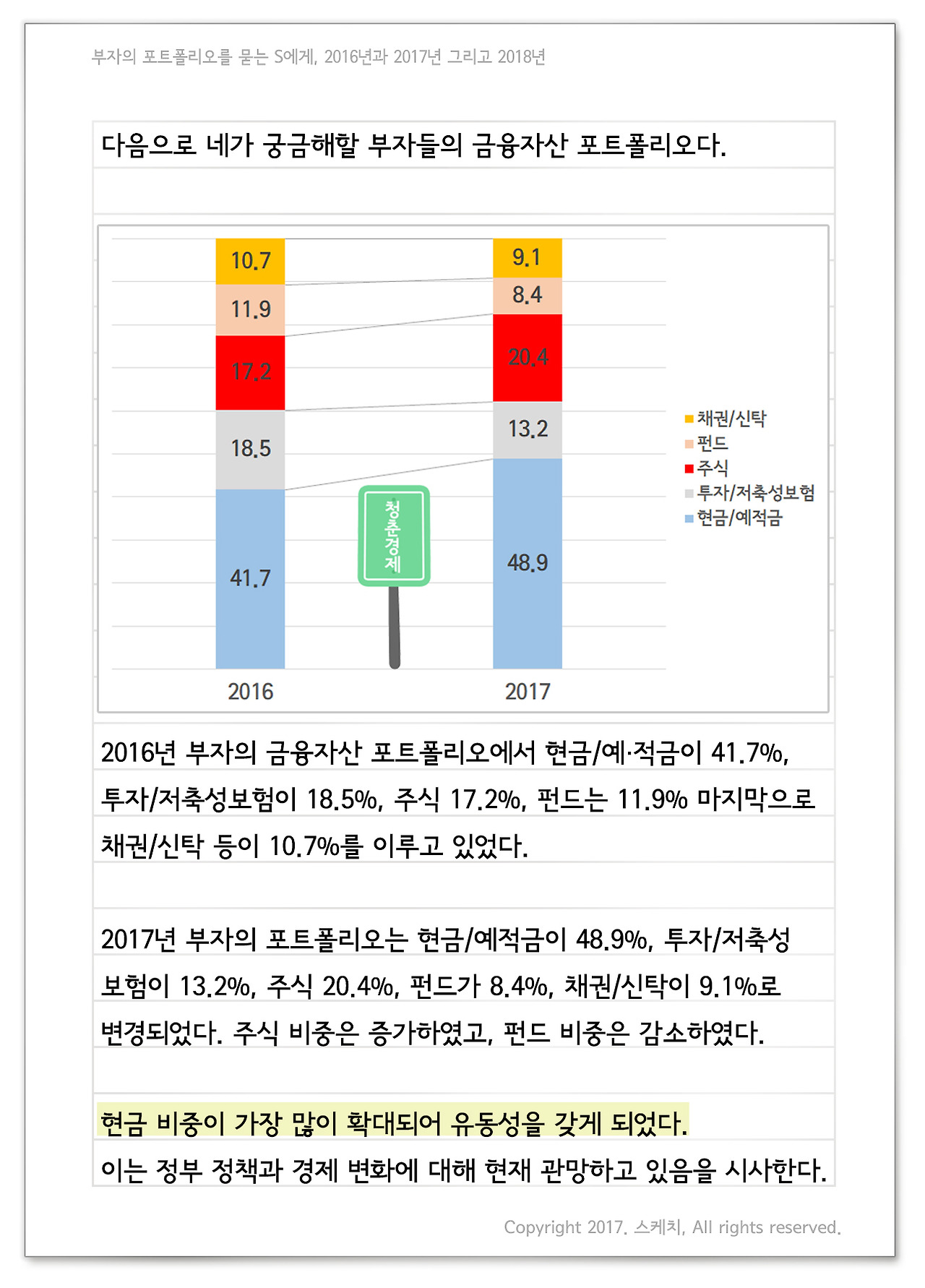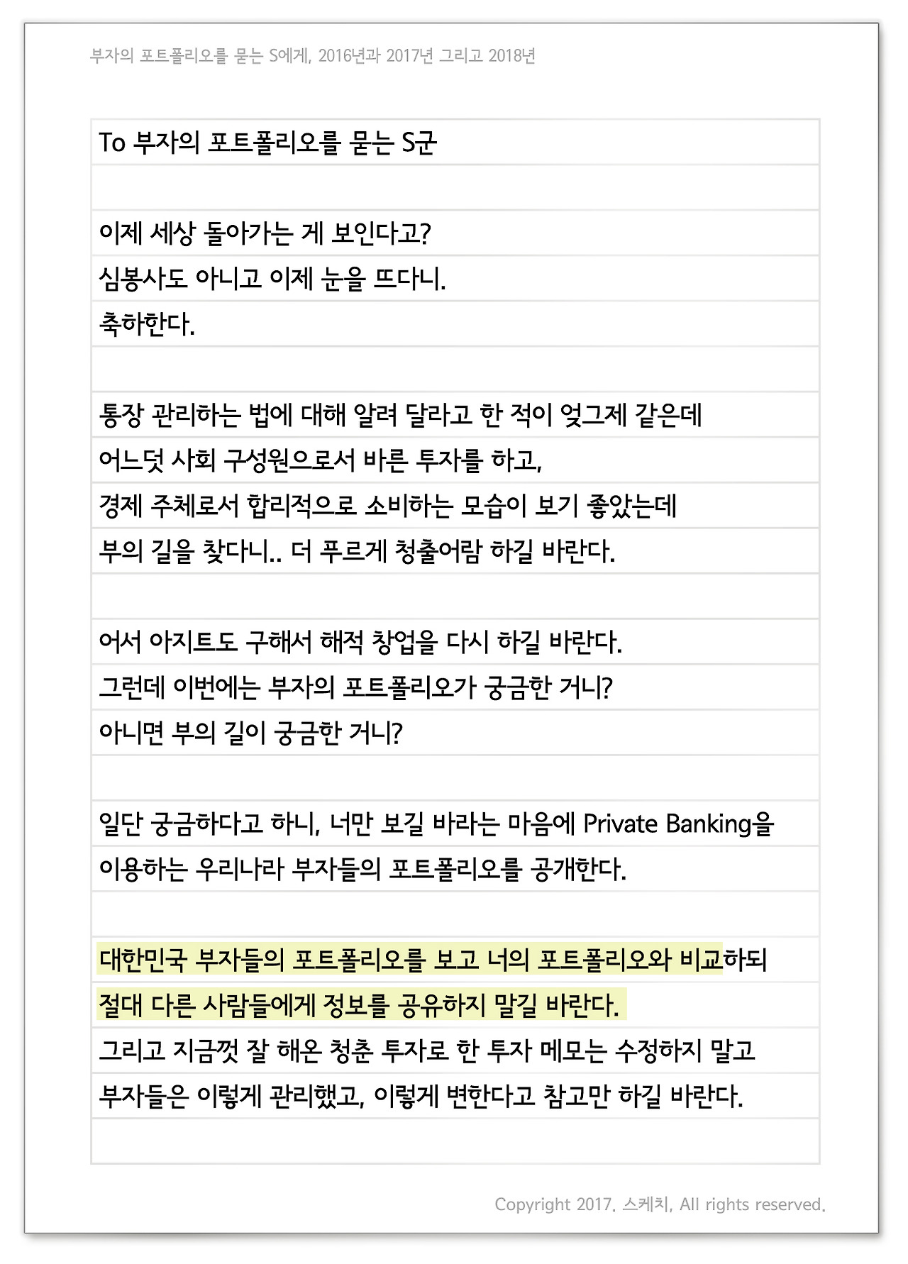 이제 세상 돌아가는 게 보인다고? 심봉사도 아니고 이제 눈을 뜨다니. 축하한다. 통장 관리하는 법에 대해 알려 달라고 한 적이 엊그제 같은데 어느덧 사회 구성원으로서 바른 투자를 하고, 경제 주체로서 합리적으로 소비하는 모습이 보기 좋았는데 부의 길이 보인다니.. 더 푸르게 청출어람 하길 바란다. 참, 경제 뉴스에 나오는 이야기에 주관적 판단도 할 수 있겠구나. 어서 다시 아지트도 구해서 해적 창업을 다시 하길 바란다. 그런데 이번에는 부자의 포트폴리오가 궁금한 거니? 아니면 부의 길이 궁금한 거니? 일단 궁금하다고 하니, 너만 보길 바라는 마음에 Private Banking을 이용하는 우리나라 부자들의 포트폴리오를 공개한다. 대한민국 부자들의 포트폴리오를 보고 너의 포트폴리오와 비교하되 절대 다른 사람들에게는 정보를 공유하지 말길 바란다. 그리고 지금껏 잘 해온 청춘 투자로 한 투자 메모는 수정하지 말고 부자들은 이렇게 관리했고, 이렇게 변한다고 참고만 하길 바란다. 먼저 자산 구성비를 공개한다. 2016년은 부동산 자산이 51.4%, 금융 자산이 43.6%이며, 2017년에는 부동산 자산이 52.2%, 금융 자산이 44.2%로 자산이 변화되었다. 이 데이터를 분석하면 부자들은 부동산과 금융자산이 고르게 형성된 것을 먼저 알 수 있으며, 기타자산 비중이 감소하면서 부동산과 금융 자산이 같이 상승했고 내년에도 지속될 전망이다. 대부분 전세를 구할 때 보유 자산을 올인 투자하는 경우가 있는데 이는 잘못된 자산 구성임을 부자의 포트폴리오에서 알 수 있다. 따라서 지속적으로 투자할 금융 자산을 가지고 있는 것이 옳다. 다음으로 자산구성비의 52.2%를 차지하고 있는 부동산 자산을 살펴보도록 하자. 빌딩/상가는 33%에서 26.2%로 줄어들었고, 오피스텔은 15.3%에서 7.5%로 줄어들었고, 아파트는 13.8%에서 36.9%로 올랐다. 아파트 투자가 많아진 것으로 보이는데 이는 강남 재건축 아파트 분양 및 조합원 매물이 27.7%를 차지한 것으로, 실제로 9.2%로 빌딩/상가, 오피스텔, 아파트 보유 자산이 모두 줄어들었다. 8.2 부동산 정부 대책 후, 다가구를 상징하는 오피스텔 자산 처분이 많아진 것으로 파악된다. 한 채는 소비로서 접근해야 하는 우리에게 다가구는 너무 먼 이야기로 듣지는 말길 바란다. 재개발을 제외한 자산보유가 줄었다는 것은 시장에 저렴한 매물이 많이 공급되었다는 의미이기 때문이다. 다음으로 네가 궁금해할 부자들의 금융자산 포트폴리오다. 2016년 부자의 금융자산 포트폴리오에서 현금/예·적금이 41.7%, 투자/저축성보험이 18.5%, 주식 17.2%, 펀드는 11.9% 마지막으로 채권/신탁 등이 10.7%를 이루고 있었다. 2017년 부자의 포트폴리오는 현금/예적금이 48.9%, 투자/저축성 보험이 13.2%, 주식 20.4%, 펀드가 8.4%, 채권/신탁이 9.1%로 변경되었다. 주식 비중은 증가하였고, 펀드 비중은 감소하였다. 현금 비중이 가장 많이 확대되어 유동성을 갖게 되었다. 이는 정부 정책과 경제 변화에 대해 현재 관망하고 있음을 시사한다. 마지막으로 해외 투자 포트폴리오다. 미국이 2016년에 7.1%에서 2017년 20.9%로 가장 많이 증가하였고, 베트남 역시 16.1%에서 25.5%로 증가하였다. 단 중국은 33.0%에서 19.1%로 줄어들었다. 미국 보호무역 정책과 금리 인상 그리고 인구학 관점의 베트남 경제 발전 등 다양한 해석으로 인한 포트폴리오 변화라 볼 수 있다. 부자의 포트폴리오를 보니 어떻니? 다른 건 몰라도 기억해줬으면 하는 건 계속 변화된다는 것이다.