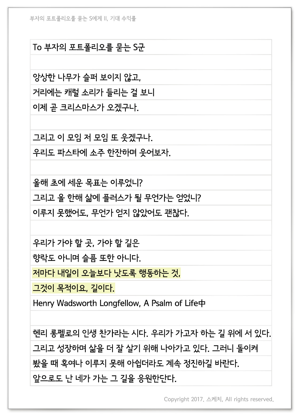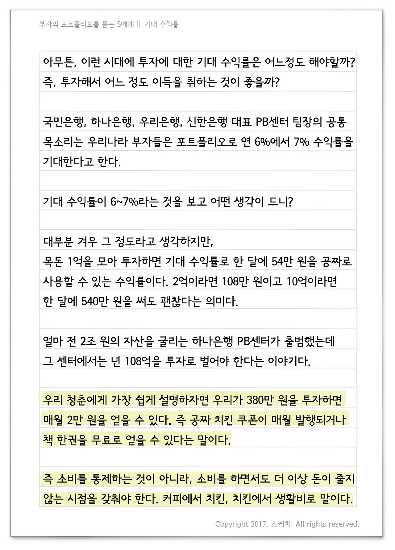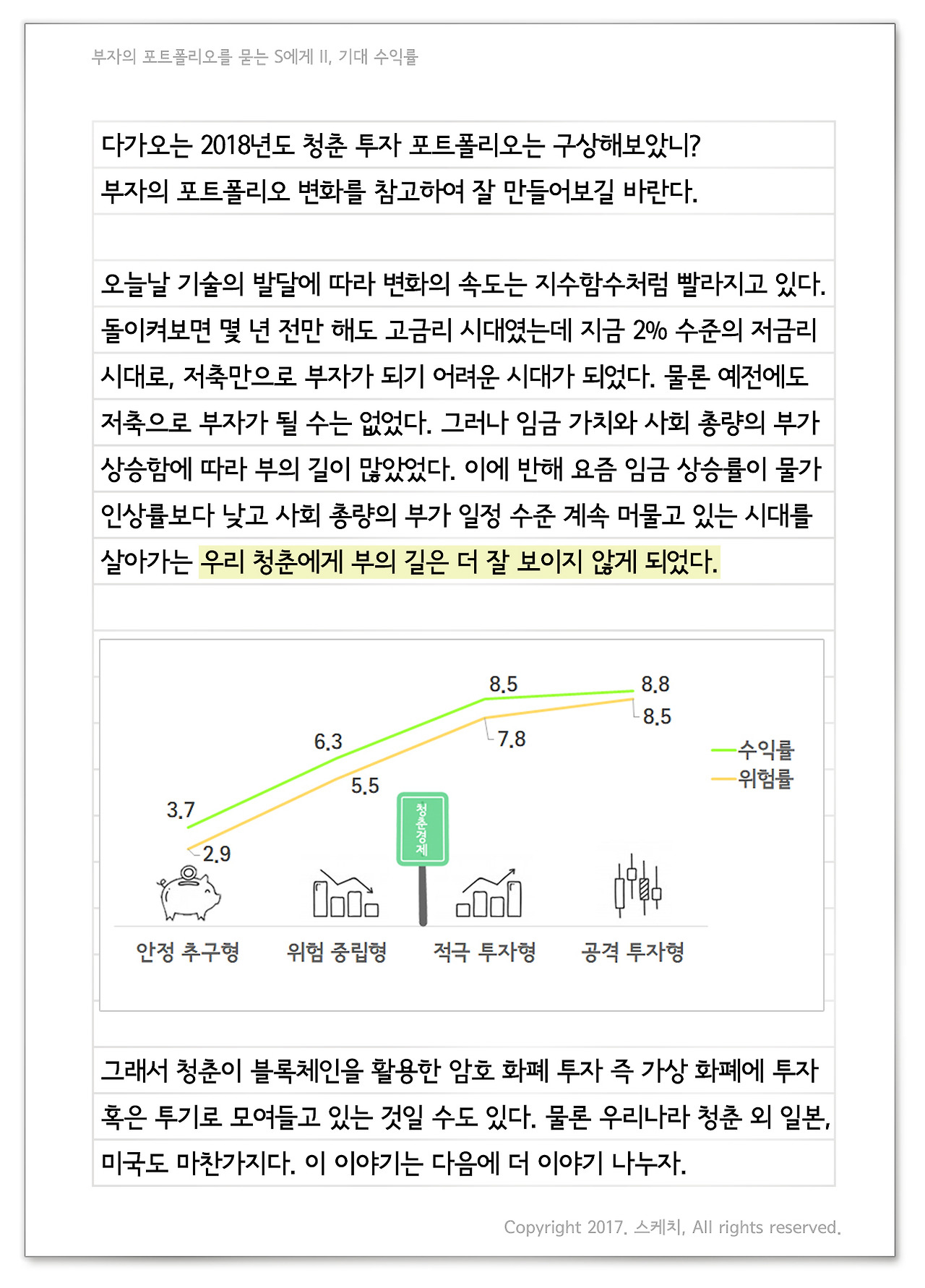 앙상한 나무가 슬퍼 보이지 않고, 거리에는 캐럴 소리가 들리는 걸 보니 이제 곧 크리스마스가 오겠구나. 그리고 이 모임 저 모임 또 웃겠구나. 우리도 파스타에 소주 한잔하며 웃어보자. 올해 초에 세운 목표는 이루었니? 그리고 올 한해 삶에 플러스가 될 무언가는 얻었니? 이루지 못했어도, 무언가 얻지 않았어도 괜찮다. 우리가 가야 할 곳, 가야 할 길은 향락도 아니며 슬픔 또한 아니다. 저마다 내일이 오늘보다 낫도록 행동하는 것, 그것이 목적이요, 길이다. Henry Wadsworth Longfellow, A Psalm of Life中 헨리 롱펠로의 인생 찬가라는 시다. 우리가 가고자 하는 길 위에 서 있다. 그리고 성장하며 삶을 더 잘 살기 위해 나아가고 있다. 그러니 돌이켜 봤을 때 혹여나 이루지 못해 아쉽더라도 계속 정진하길 바란다. 앞으로도 난 네가 가는 그 길을 응원한단다. 다가오는 2018년도 청춘 투자 포트폴리오는 구상해보았니? 부자의 포트폴리오 변화를 참고하여 잘 만들어보길 바란다. 오늘날 기술의 발달에 따라 변화의 속도는 지수함수처럼 빨라지고 있다. 돌이켜보면 몇 년 전만 해도 고금리 시대였는데 지금 2% 수준의 저금리 시대로, 저축만으로 부자가 되기 어려운 시대가 되었다. 물론 예전에도 저축으로 부자가 될 수는 없었다. 그러나 임금 가치와 사회 총량의 부가 상승함에 따라 부의 길이 많았었다. 이에 반해 요즘 임금 상승률이 물가 인상률보다 낮고 사회 총량의 부가 일정 수준 계속 머물고 있는 시대를 살아가는 우리 청춘에게 부의 길은 더 잘 보이지 않게 되었다. 그래서 청춘이 블록체인을 활용한 암호 화폐 투자 즉 가상 화폐에 투자 혹은 투기로 모여들고 있는 것일 수도 있다. 물론 우리나라 청춘 외 일본, 미국도 마찬가지다. 이 이야기는 다음에 더 이야기 나누자. 아무튼, 이런 시대에 투자에 대한 기대 수익률은 어느정도 해야할까? 즉, 투자해서 어느 정도 이득을 취하는 것이 좋을까? 국민은행, 하나은행, 우리은행, 신한은행 대표 PB센터 팀장의 공통