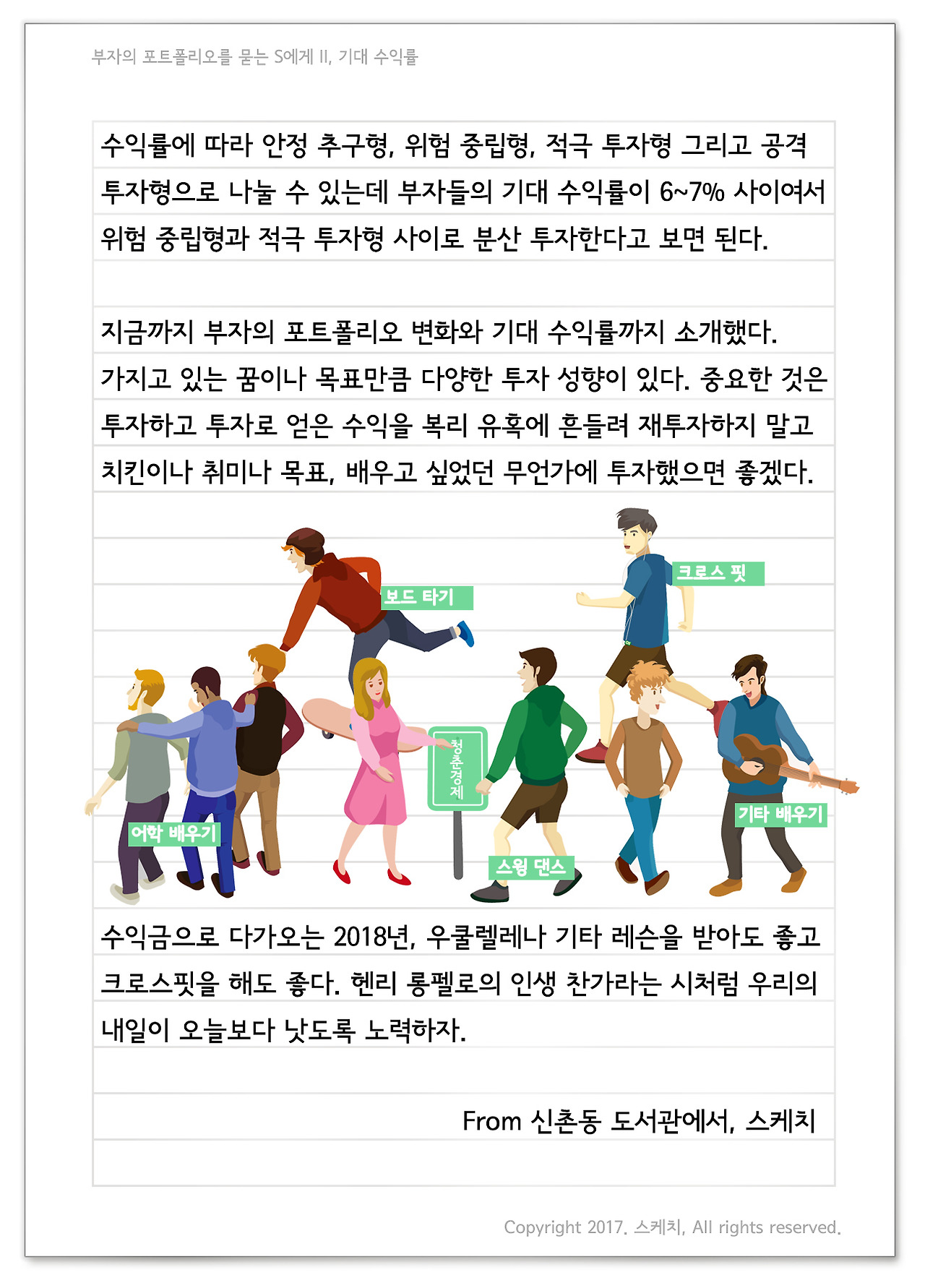 목소리는 우리나라 부자들은 포트폴리오로 연 6%에서 7% 수익률을 기대한다고 한다. 기대 수익률이 6~7%라는 것을 보고 어떤 생각이 드니? 대부분 겨우 그 정도라고 생각하지만, 목돈 1억을 모아 투자하면 기대 수익률로 한 달에 54만 원을 공짜로 사용할 수 있는 수익률이다. 2억이라면 108만 원이고 10억이라면 한 달에 540만 원을 써도 괜찮다는 의미다. 얼마 전 2조 원의 자산을 굴리는 하나은행 PB센터가 출범했는데 그 센터에서는 년 108억을 투자로 벌어야 한다는 이야기다. 우리 청춘에게 가장 쉽게 설명하자면 우리가 380만 원을 투자하면 매월 2만 원을 얻을 수 있다. 즉 공짜 치킨 쿠폰이 매월 발행되거나 책 한권을 무료로 얻을 수 있다는 말이다. 즉 소비를 통제하는 것이 아니라, 소비를 하면서도 더 이상 돈이 줄지 않는 시점을 갖춰야 한다. 커피에서 치킨, 치킨에서 생활비로 말이다. 수익률에 따라 안정 추구형, 위험 중립형, 적극 투자형 그리고 공격 투자형으로 나눌 수 있는데 부자들의 기대 수익률이 6~7% 사이여서 위험 중립형과 적극 투자형 사이로 분산 투자한다고 보면 된다. 지금까지 부자의 포트폴리오 변화와 기대 수익률까지 소개했다. 가지고 있는 꿈이나 목표만큼 다양한 투자 성향이 있다. 중요한 것은 투자하고 투자로 얻은 수익을 복리 유혹에 흔들려 재투자하지 말고 치킨이나 취미나 목표, 배우고 싶었던 무언가에 투자했으면 좋겠다. 수익금으로 다가오는 2018년, 우쿨렐레나 기타 레슨을 받아도 좋고 크로스핏을 해도 좋다. 헨리 롱펠로의 인생 찬가라는 시처럼 우리의 내일이 오늘보다 낫도록 노력하자.