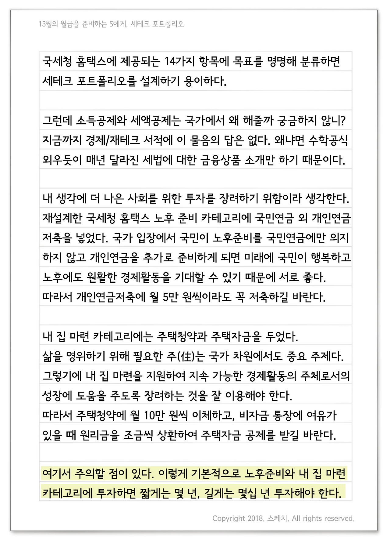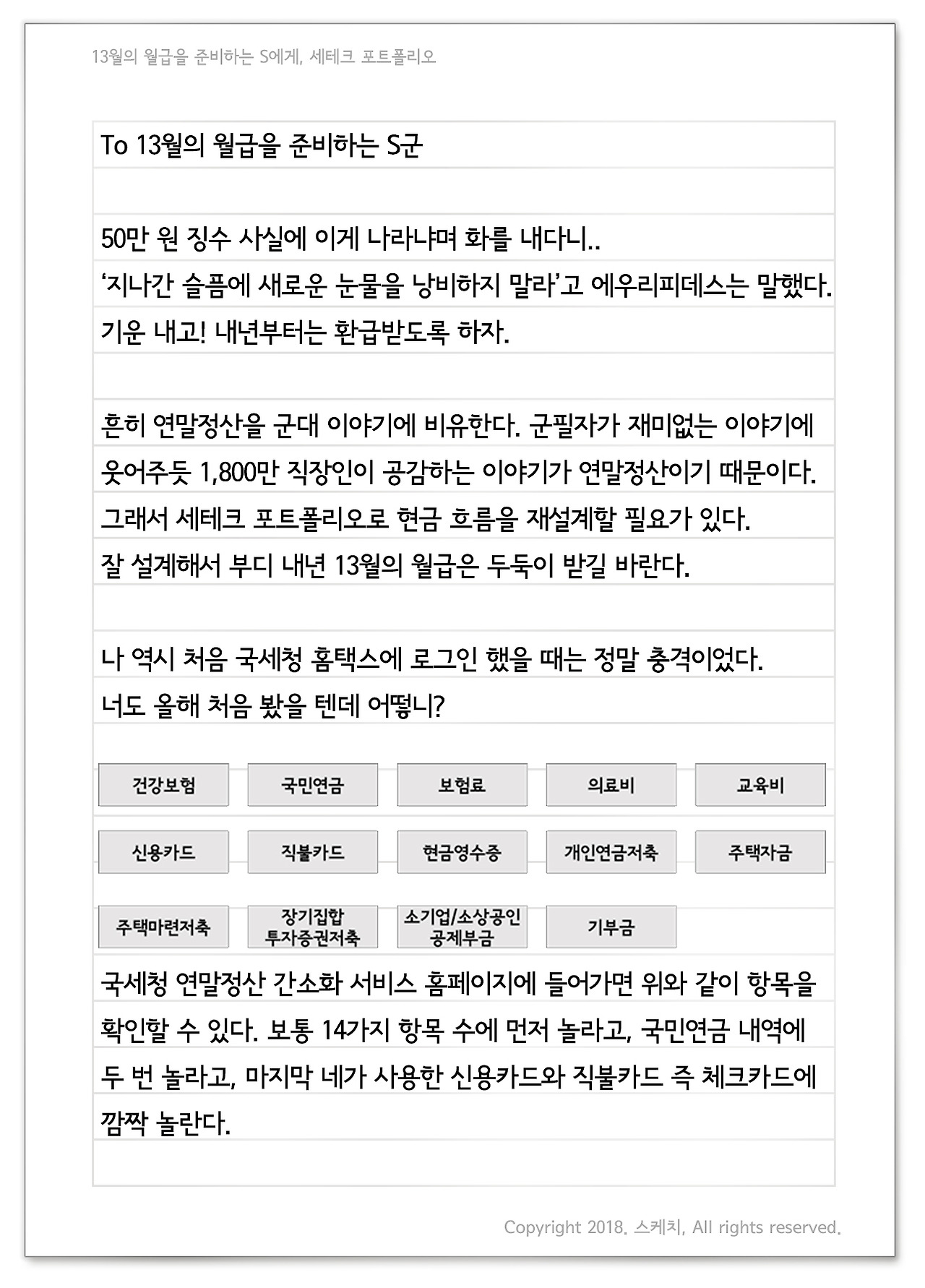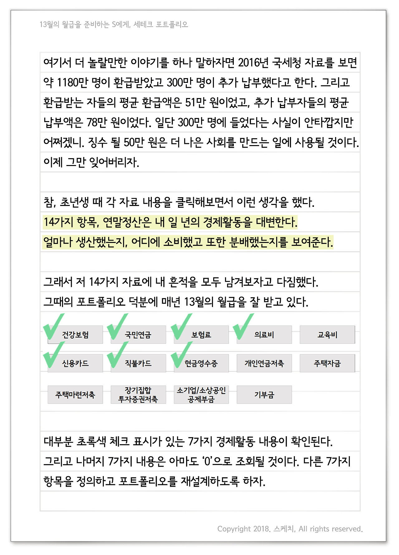 50만 원 징수 사실에 이게 나라냐며 화를 내다니.. ‘지나간 슬픔에 새로운 눈물을 낭비하지 말라’고 에우리피데스는 말했다. 기운 내고! 내년부터는 환급받도록 하자. 흔히 연말정산을 군대 이야기에 비유한다. 군필자가 재미없는 이야기에 웃어주듯 1,800만 직장인이 공감하는 이야기가 연말정산이기 때문이다. 그래서 세테크 포트폴리오로 현금 흐름을 재설계할 필요가 있다. 잘 설계해서 부디 내년 13월의 월급은 두둑이 받길 바란다. 나 역시 처음 국세청 홈택스에 로그인 했을 때는 정말 충격이었다. 너도 올해 처음 봤을 텐데 어떻니? 국세청 연말정산 간소화 서비스 홈페이지에 들어가면 위와 같이 항목을 확인할 수 있다. 보통 14가지 항목 수에 먼저 놀라고, 국민연금 내역에 두 번 놀라고, 마지막 네가 사용한 신용카드와 직불카드 즉 체크카드에 깜짝 놀란다. 여기서 더 놀랄만한 이야기를 하나 말하자면 2016년 국세청 자료를 보면 약 1180만 명이 환급받았고 300만 명이 추가 납부했다고 한다. 그리고 환급받는 자들의 평균 환급액은 51만 원이었고, 추가 납부자들의 평균 납부액은 78만 원이었다. 일단 300만 명에 들었다는 사실이 안타깝지만 어쩌겠니. 징수 될 50만 원은 더 나은 사회를 만드는 일에 사용될 것이다. 이제 그만 잊어버리자. 참, 초년생 때 각 자료 내용을 클릭해보면서 이런 생각을 했다. 14가지 항목은 내 일 년의 경제활동을 대변한다. 얼마나 생산했는지, 어디에 소비했고 또한 분배했는지를 보여준다. 그래서 저 14가지 자료에 내 흔적을 모두 남겨보자고 다짐했다. 그때의 포트폴리오 덕분에 매년 13월의 월급을 잘 받고 있다. 대부분 초록색 체크 표시가 있는 7가지 경제활동 내용이 확인된다. 그리고 나머지 7가지 내용은 아마도 ‘0’으로 조회될 것이다. 다른 7가지 항목을 정의하고 포트폴리오를 재설계하도록 하자. 먼저 이름부터 어려운 것부터, 장기집합투자증권저축은 2015년까지 제공되어 가입할 수 없다. 패스. 소기업/소상공인 공제부금은 소상공인 지원에 해당된다. 이것도 패스. 주택자금과 주택마련 저축 항목을 알아가 보자. 주택자금과 주택마련저축은 묶어서 생각하면 더 좋다. 둘이 합쳐서 연간 300만 원이 공제 가능한데 주택마련저축은 주택청약종합저축을 말한다. 주택청약종합저축은 연간 240만 원까지 납입액의 40%가 공제된다. 주택자금은 주택임차차입금 원리금상환액과 장기주택저당차입금 이자 상환액이 있다. 주택임차차입금 원리금상환액이란 무주택 세대주가 국민주택규모의 주택을 임차하고자 금융회사에 주택임차 자금을 차입하였고 한 해동안 갚은 원리금을 말한다. 상환액의 40%가 공제된다. 그다음, 장기주택저당차입금 이자상환액이란 무주택자나 주택을 하나 소유한 세대주가 취득 시 기준시가 4억 원 이하인 주택을 취득하기 위해 그 주택에 저당권을 설정하고 금융회사에 차입한 장기주택저당차입금의 이자를 지급했을 때 해당 과세기간에 지급한 이자 상환액이 공제된다. 따라서 주택임차차입금 즉 전세자금대출을 상환하거나 주택청약종합저축으로 주택자금을 공제받도록 포트폴리오를 설계하는 것이 좋다. 다음 기부금이다. 정치자금, 법정, 우리사주조합, 지정 기부금 등이 있다. 공익단체는 연봉의 30%, 종교단체는 연봉의 10%까지 공제가 가능하다. 정치자금의 경우 10만 원까지는 세액공제로 90.9%가 공제된다.10만 원 이상부터 연봉 내에서 15%가 공제된다. 개인연금저축은 국민연금 외 개인적으로 가입한 연금저축을 말한다. 연간 400만 원 한도로 15% 공제된다. 단 총급여 5,500만 원 이상은 12%가 공제된다. 이밖에 개인형 퇴직연금, 확정기여형 퇴직연금은 총 700만 원 한도로 15% 공제되는데 마찬가지로 총급여 5,500만 원 이상은 12% 공제된다. 자 그럼 본격적으로 세테크 포트폴리오를 설계해보자. 국세청 홈택스에 제공되는 14가지 항목에 목표를 명명해 분류하면 세테크 포트폴리오를 설계하기 용이하다. 그런데 소득공제와 세액공제는 국가에서 왜 해줄까 궁금하지 않니? 지금까지 경제/재테크 서적에 이 물음의 답은 없다. 왜냐면 수학공식 외우듯이 매년 달라진 세법에 대한 금융상품 소개만 하기 때문이다. 내 생각에 더 나은 사회를 위한 투자를 장려하기 위함이라 생각한다. 재설계한 국세청 홈택스 노후 준비 카테고리에 국민연금 외 개인연금저축을 넣었다. 국가 입장에서 국민이 노후준비를 국민연금에만 의지하지 않고 개인연금을 추가로 준비하게 되면 미래에 국민이 행복하고 노후에도 원활한 경제활동을 기대할 수 있기 때문이다. 서로 좋다. 따라서 개인연금저축에 월 5만 원씩이라도 꼭 저축하길 바란다. 내 집 마련 카테고리에는 주택청약과 주택자금을 두었다. 삶을 영위하기 위해 필요한 주(住)는 국가 차원에서도 중요 주제다. 그렇기에 내 집 마련을 지원하여 지속 가능한 경제활동의 주체로의 성장에 도움을 주도록 장려하여 서로 윈윈할 수 있다. 따라서 주택청약에 월 10만 원씩 이체하고, 비자금 통장에 여유가 있을 때 원리금을 조금씩 상환하여 주택자금을 공제받길 바란다. 여기서 주의할 점이 있다. 이렇게 기본적으로 노후준비와 내 집 