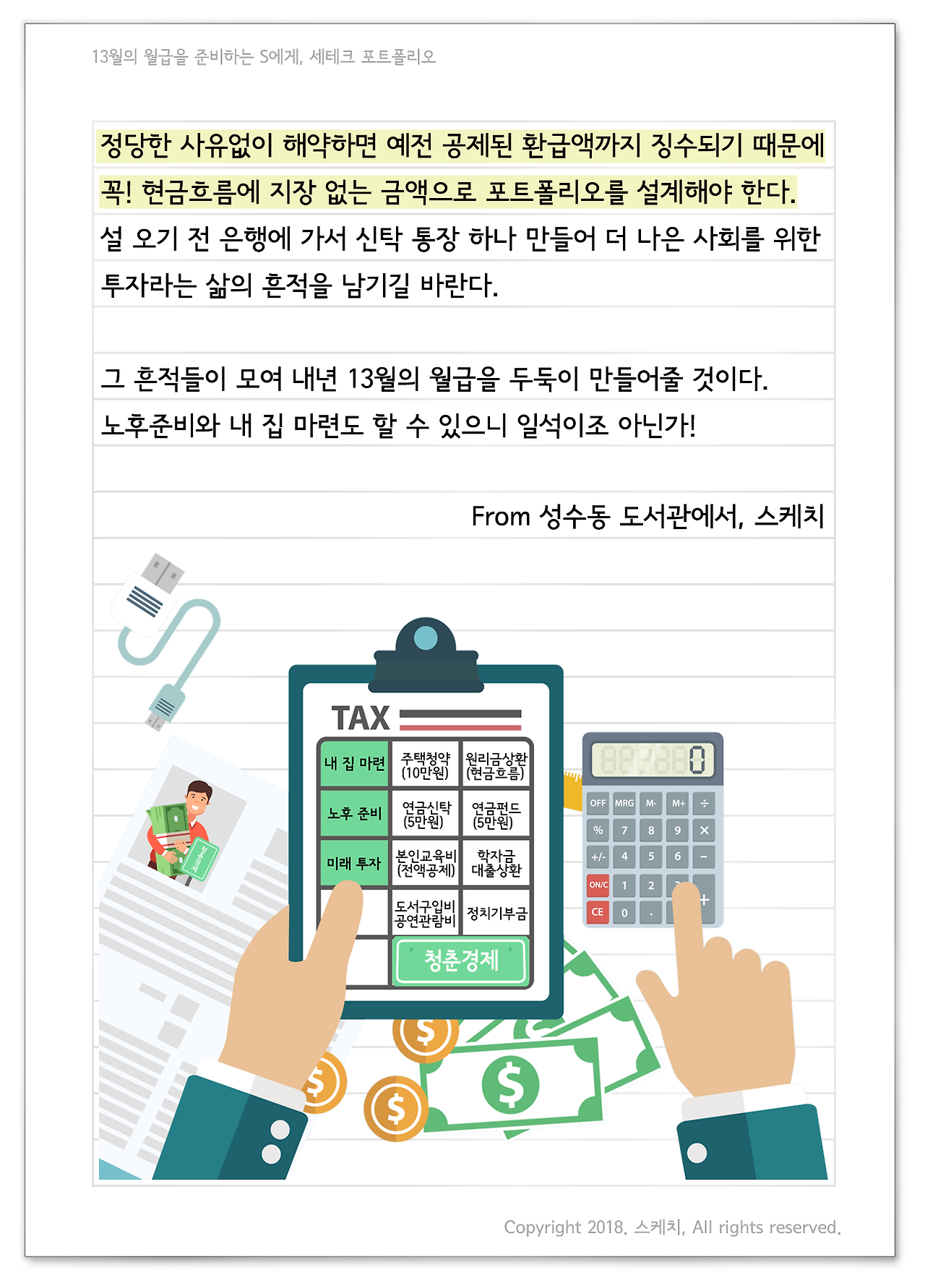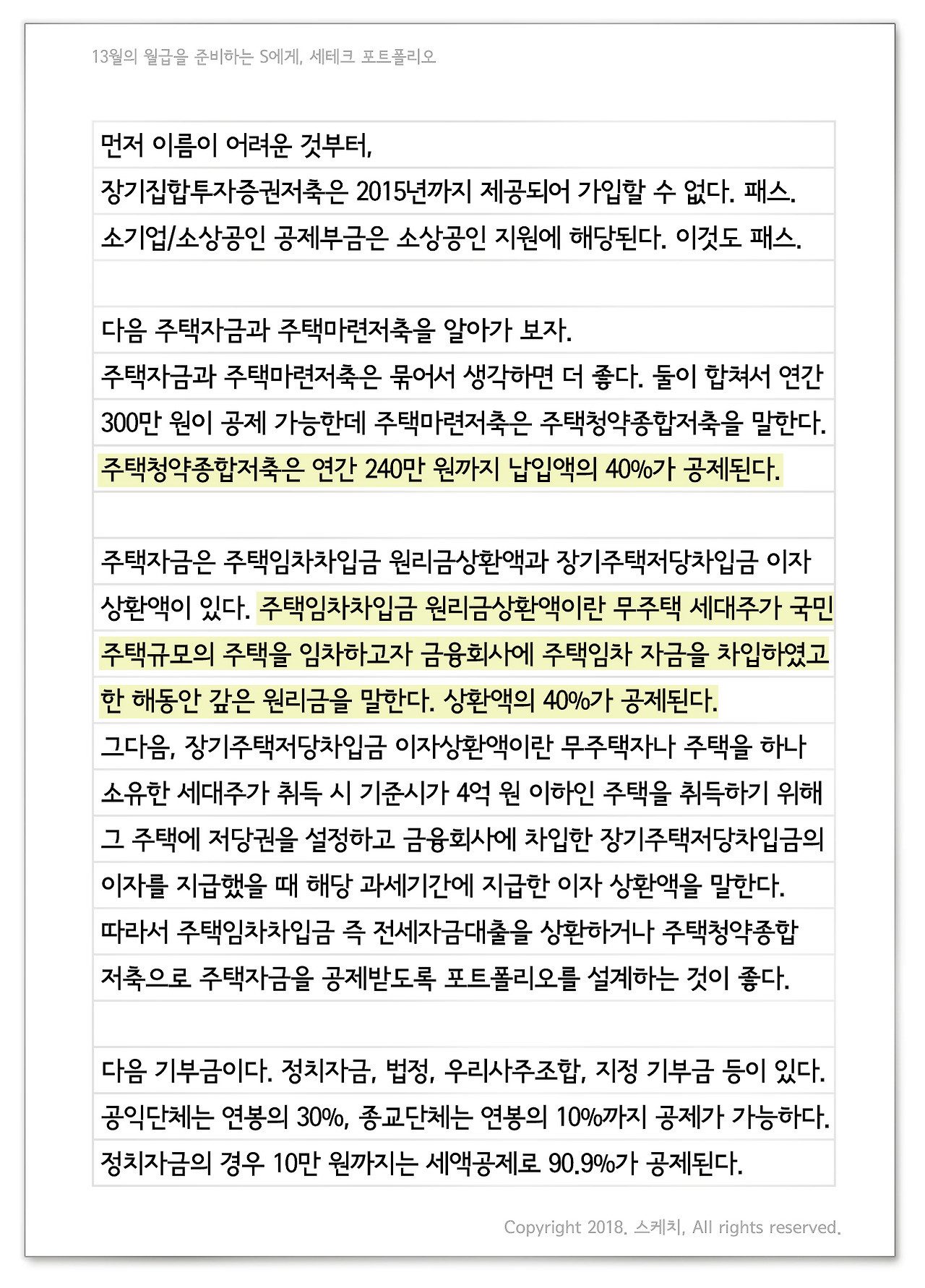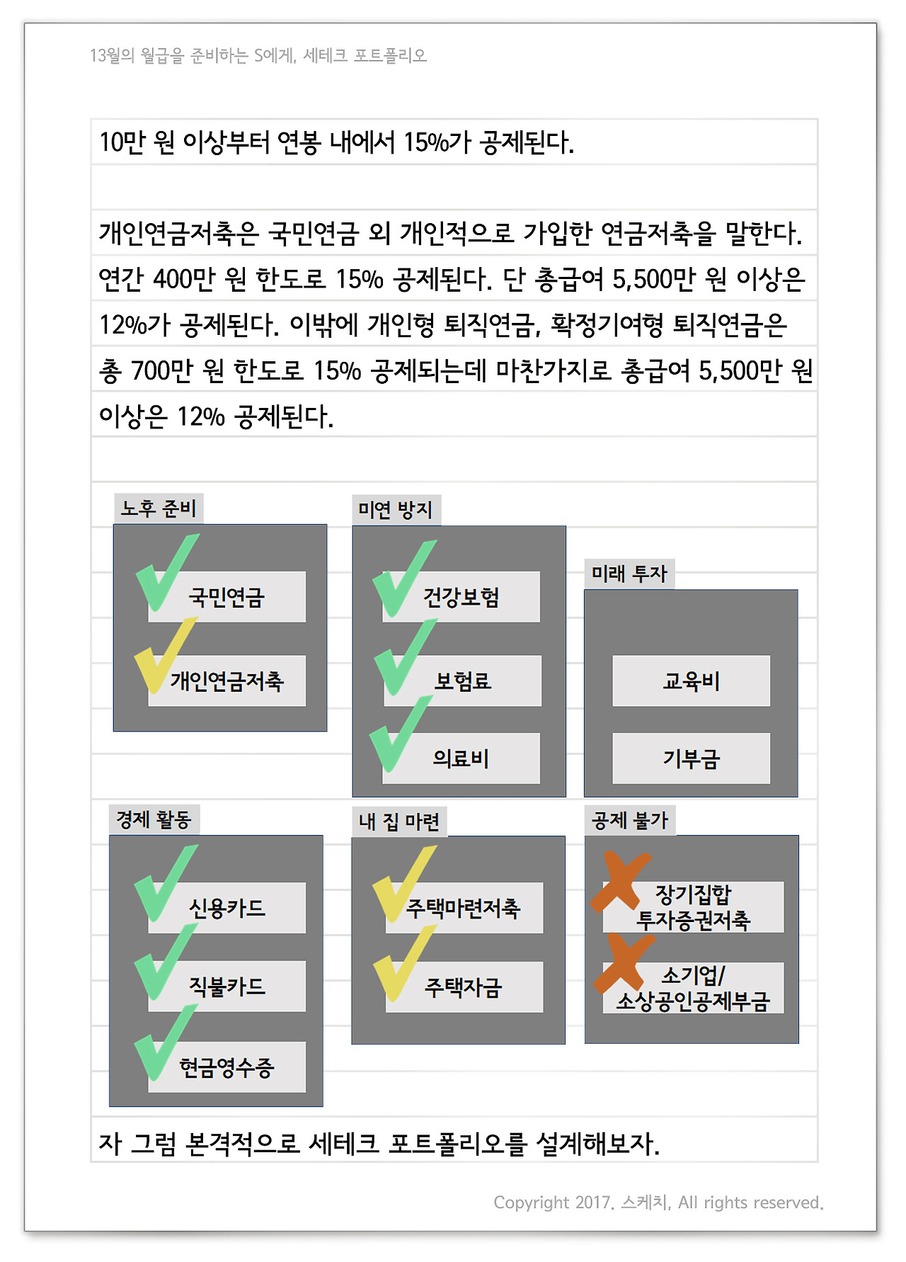 50만 원 징수 사실에 이게 나라냐며 화를 내다니.. ‘지나간 슬픔에 새로운 눈물을 낭비하지 말라’고 에우리피데스는 말했다. 기운 내고! 내년부터는 환급받도록 하자. 흔히 연말정산을 군대 이야기에 비유한다. 군필자가 재미없는 이야기에 웃어주듯 1,800만 직장인이 공감하는 이야기가 연말정산이기 때문이다. 그래서 세테크 포트폴리오로 현금 흐름을 재설계할 필요가 있다. 잘 설계해서 부디 내년 13월의 월급은 두둑이 받길 바란다. 나 역시 처음 국세청 홈택스에 로그인 했을 때는 정말 충격이었다. 너도 올해 처음 봤을 텐데 어떻니? 국세청 연말정산 간소화 서비스 홈페이지에 들어가면 위와 같이 항목을 확인할 수 있다. 보통 14가지 항목 수에 먼저 놀라고, 국민연금 내역에 두 번 놀라고, 마지막 네가 사용한 신용카드와 직불카드 즉 체크카드에 깜짝 놀란다. 여기서 더 놀랄만한 이야기를 하나 말하자면 2016년 국세청 자료를 보면 약 1180만 명이 환급받았고 300만 명이 추가 납부했다고 한다. 그리고 환급받는 자들의 평균 환급액은 51만 원이었고, 추가 납부자들의 평균 납부액은 78만 원이었다. 일단 300만 명에 들었다는 사실이 안타깝지만 어쩌겠니. 징수 될 50만 원은 더 나은 사회를 만드는 일에 사용될 것이다. 이제 그만 잊어버리자. 참, 초년생 때 각 자료 내용을 클릭해보면서 이런 생각을 했다. 14가지 항목은 내 일 년의 경제활동을 대변한다. 얼마나 생산했는지, 어디에 소비했고 또한 분배했는지를 보여준다. 그래서 저 14가지 자료에 내 흔적을 모두 남겨보자고 다짐했다. 그때의 포트폴리오 덕분에 매년 13월의 월급을 잘 받고 있다. 대부분 초록색 체크 표시가 있는 7가지 경제활동 내용이 확인된다. 그리고 나머지 7가지 내용은 아마도 ‘0’으로 조회될 것이다. 다른 7가지 항목을 정의하고 포트폴리오를 재설계하도록 하자. 먼저 이름부터 어려운 것부터, 장기집합투자증권저축은 2015년까지 제공되어 가입할 수 없다. 패스. 소기업/소상공인 공제부금은 소상공인 지원에 해당된다. 이것도 패스. 주택자금과 주택마련 저축 항목을 알아가 보자. 주택자금과 주택마련저축은 묶어서 생각하면 더 좋다. 둘이 합쳐서 연간 300만 원이 공제 가능한데 주택마련저축은 주택청약종합저축을 말한다. 주택청약종합저축은 연간 240만 원까지 납입액의 40%가 공제된다. 주택자금은 주택임차차입금 원리금상환액과 장기주택저당차입금 이자 상환액이 있다. 주택임차차입금 원리금상환액이란 무주택 세대주가 국민주택규모의 주택을 임차하고자 금융회사에 주택임차 자금을 차입하였고 한 해동안 갚은 원리금을 말한다. 상환액의 40%가 공제된다. 그다음, 장기주택저당차입금 이자상환액이란 무주택자나 주택을 하나 소유한 세대주가 취득 시 기준시가 4억 원 이하인 주택을 취득하기 위해 그 주택에 저당권을 설정하고 금융회사에 차입한 장기주택저당차입금의 이자를 지급했을 때 해당 과세기간에 지급한 이자 상환액이 공제된다. 따라서 주택임차차입금 즉 전세자금대출을 상환하거나 주택청약종합저축으로 주택자금을 공제받도록 포트폴리오를 설계하는 것이 좋다. 다음 기부금이다. 정치자금, 법정, 우리사주조합, 지정 기부금 등이 있다. 공익단체는 연봉의 30%, 종교단체는 연봉의 10%까지 공제가 가능하다. 정치자금의 경우 10만 원까지는 세액공제로 90.9%가 공제된다.10만 원 이상부터 연봉 내에서 15%가 공제된다. 개인연금저축은 국민연금 외 개인적으로 가입한 연금저축을 말한다. 연간 400만 원 한도로 15% 공제된다. 단 총급여 5,500만 원 이상은 12%가 공제된다. 이밖에 개인형 퇴직연금, 확정기여형 퇴직연금은 총 700만 원 한도로 15% 공제되는데 마찬가지로 총급여 5,500만 원 이상은 12% 공제된다. 자 그럼 본격적으로 세테크 포트폴리오를 설계해보자. 국세청 홈택스에 제공되는 14가지 항목에 목표를 명명해 분류하면 세테크 포트폴리오를 설계하기 용이하다. 그런데 소득공제와 세액공제는 국가에서 왜 해줄까 궁금하지 않니? 지금까지 경제/재테크 서적에 이 물음의 답은 없다. 왜냐면 수학공식 외우듯이 매년 달라진 세법에 대한 금융상품 소개만 하기 때문이다. 내 생각에 더 나은 사회를 위한 투자를 장려하기 위함이라 생각한다. 재설계한 국세청 홈택스 노후 준비 카테고리에 국민연금 외 개인연금저축을 넣었다. 국가 입장에서 국민이 노후준비를 국민연금에만 의지하지 않고 개인연금을 추가로 준비하게 되면 미래에 국민이 행복하고 노후에도 원활한 경제활동을 기대할 수 있기 때문이다. 서로 좋다. 따라서 개인연금저축에 월 5만 원씩이라도 꼭 저축하길 바란다. 내 집 마련 카테고리에는 주택청약과 주택자금을 두었다. 삶을 영위하기 위해 필요한 주(住)는 국가 차원에서도 중요 주제다. 그렇기에 내 집 마련을 지원하여 지속 가능한 경제활동의 주체로의 성장에 도움을 주도록 장려하여 서로 윈윈할 수 있다. 따라서 주택청약에 월 10만 원씩 이체하고, 비자금 통장에 여유가 있을 때 원리금을 조금씩 상환하여 주택자금을 공제받길 바란다. 여기서 주의할 점이 있다. 이렇게 기본적으로 노후준비와 내 집 