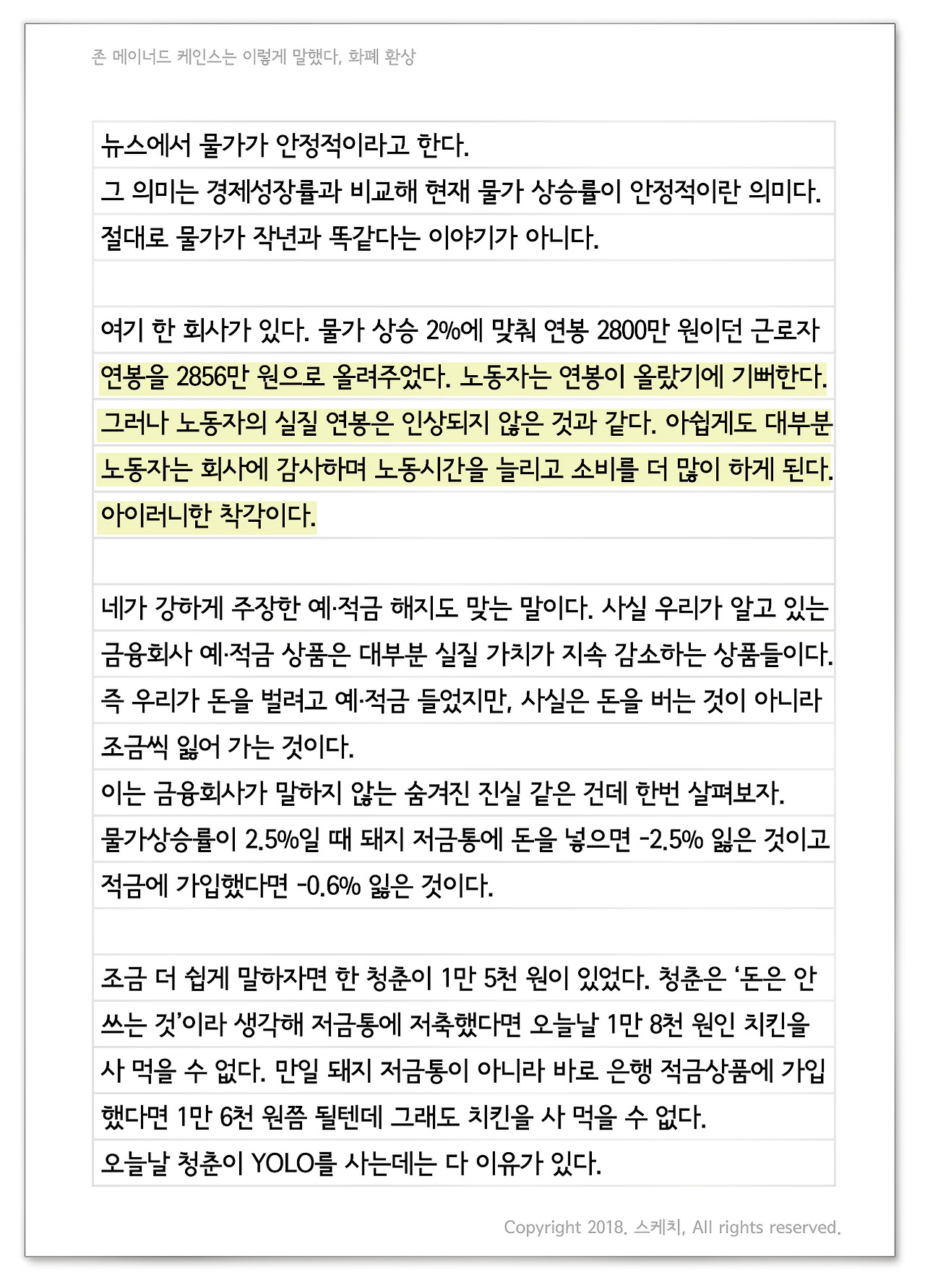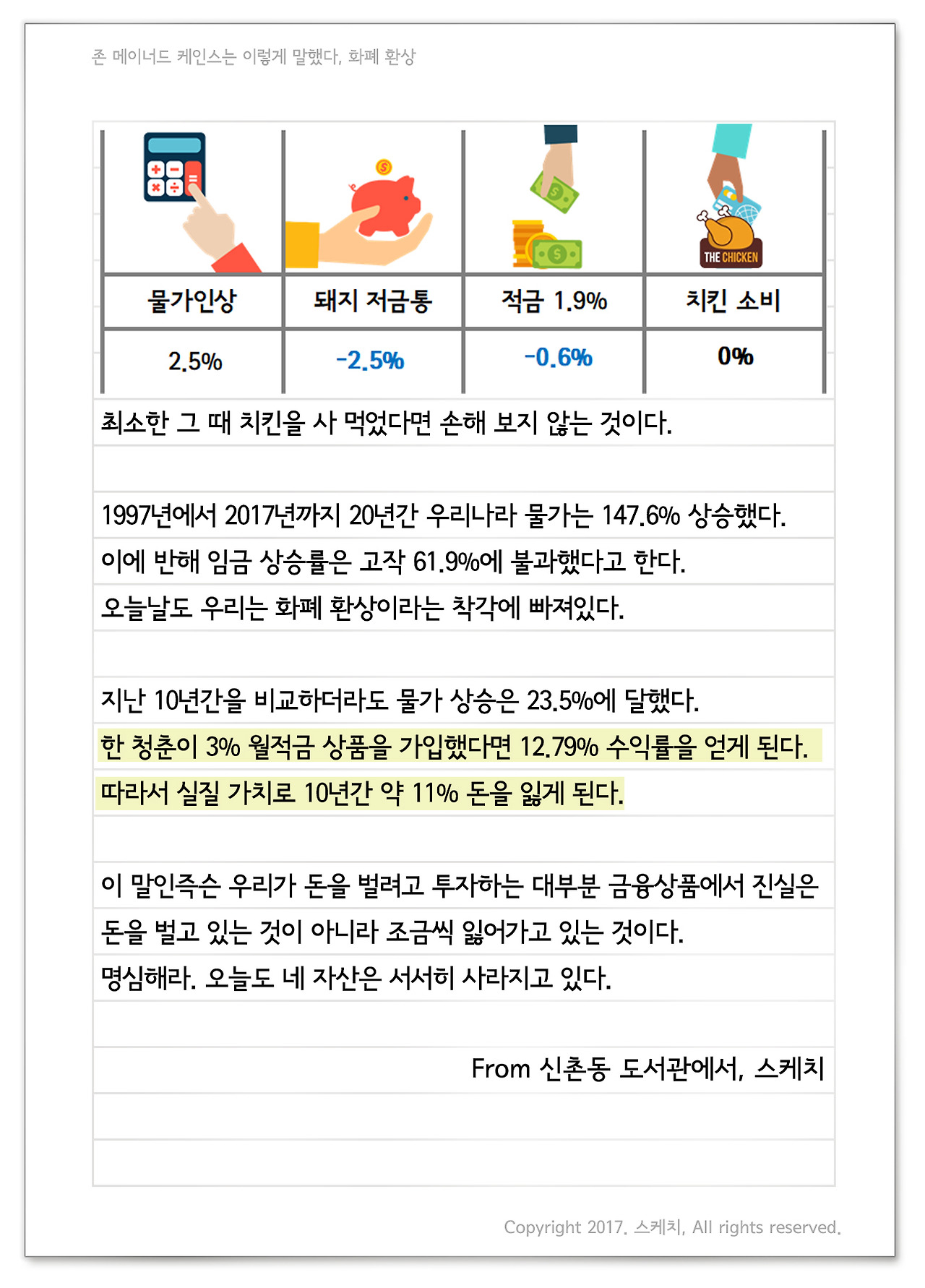 상승했고 다른 청춘은 본사에서 평균적인 평가로 임금이 3% 올랐다. 어느 청춘이 좋은 상황인가? 베트남 지사에서 근무하는 청년이라고 생각하니? 얼핏 보면 인고과를 잘 받은 베트남 지사에서 근무한 청춘의 삶이 더 윤택하리라 생각할 수 있다. 대다수 청춘도 그렇게 생각한다. 그리고 케인스는 이를 화폐 환상이라 정의했다. 물가를 고려하지 않고 명목상 임금은 실질적 가치를 반영하지 못함에도 노동자는 단순한 액면 화폐 액으로만 의사결정을 한다는 것이다. 청춘이 물가 상승보다 낮은 비율로 임금이 상승했는데도 불구하고 임금이 올랐다고 생각한다는 것이다. 베트남 지사에서 근무하는 청춘은 현지 화폐 기준으로 4% 적은 임금을 받게 되고, 미국 본사에서 근무하는 청춘은 현지 화폐 기준으로 2% 상승한 실질 가치를 받게 된 것이다. 다시 물어본다. 어느 청춘이 좋은 상황인가? 그렇다. 실질 임금 가치가 상승한 미국 본사에서 근무하는 청년이다. 뉴스에서 물가가 안정적이라고 한다. 그 의미는 경제성장률과 비교해 현재 물가 상승률이 안정적이란 의미다. 절대로 물가가 작년과 똑같다는 이야기가 아니다. 여기 한 회사가 있다. 물가 상승 2%에 맞춰 연봉 2800만 원이던 근로자 연봉을 2856만 원으로 올려주었다. 노동자는 연봉이 올랐기에 기뻐한다. 그러나 노동자의 실질 연봉은 인상되지 않은 것과 같다. 아쉽게도 대부분 노동자는 회사에 감사하며 노동시간을 늘리고 소비를 더 많이 하게 된다. 아이러니한 착각이다. 네가 강하게 주장한 예·적금 해지도 맞는 말이다. 사실 우리가 알고 있는 금융회사 예·적금 상품은 대부분 실질 가치가 지속 감소하는 상품들이다. 즉 우리가 돈을 벌려고 예·적금 들었지만, 사실은 돈을 버는 것이 아니라 조금씩 잃고 있어 가는 것이다. 이는 금융회사가 말하지 않는 숨겨진 진실 같은 건데 한번 살펴보자. 물가상승률이 2.5%일 때 돼지 저금통에 돈을 넣으면 -2.5% 잃은 것이고 적금에 가입했다면 -0.6% 잃은 것이다. 조금 더 쉽게 말하자면 한 청춘이 1만 5천 원이 있었다. 청춘은 ‘돈은 안 쓰는 것’이라 생각해 저금통에 저축했다면 오늘날 1만 8천 원인 치킨을 사 먹을 수 없다. 만일 돼지 저금통이 아니라 바로 은행 적금상품에 가입했다면 1만 6천쯤 될 것인데 그래도 치킨을 사 먹을 수 없다. 오늘날 청춘이 YOLO를 사는데는 다 이유가 있다. 최소한 그 때 치킨을 사 먹었다면 손해 보지 않는 것이다. 1997년에서 2017년까지 20년간 우리나라 물가는 47.6% 상승했다. 이에 반해 임금 상승률은 고작 61.9%에 불과했다고 한다. 오늘날도 우리는 화폐 환상이라는 착각에 빠져있다. 지난 10년간을 비교하더라도 물가 상승은 23.5%에 달했다. 한 청춘이 3% 월적금 상품을 가입했다면 12.79% 수익률을 얻게 된다.따라서 실질 가치로 10년간 약 11% 돈을 잃게 된다. 이 말인즉슨 우리가 돈을 벌려고 투자하는 대부분 금융상품에서 진실은 돈을 벌고 있는 것이 아니라 조금씩 잃거나 덜 잃어가고 있는 것이다. 명심해라. 오늘도 네 자산은 서서히 사라지고 있다.