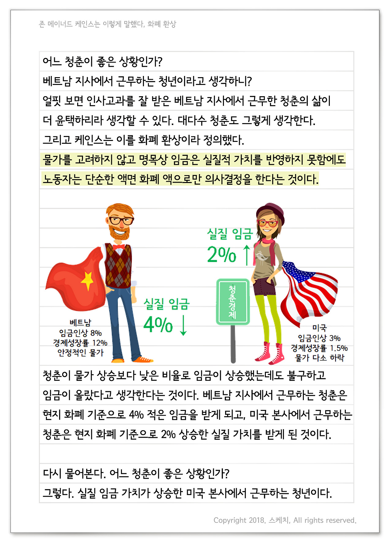예·적금을 해지하겠다니 생각은 훌륭하나 그럴 필요 없다. 이제라도 알았으면 되었다. 그것만으로 충분히 성장했다. 현재 화폐 시스템은 본질적인 가치가 없다. 실질 가치는 물가에서 비롯된다. 따라서 가치 변화를 시간에 따른 지수 변화에서 찾아야 하는데 우리는 화폐 액 변화로만 판단한다. 존 메이너드 케인스, 고용 이자 및 화폐의 일반이론中 예를 들어 두 청춘이 있다. 한 청춘은 베트남 지사에서 근무하는데 업무 성과가 좋아 임금이 8%