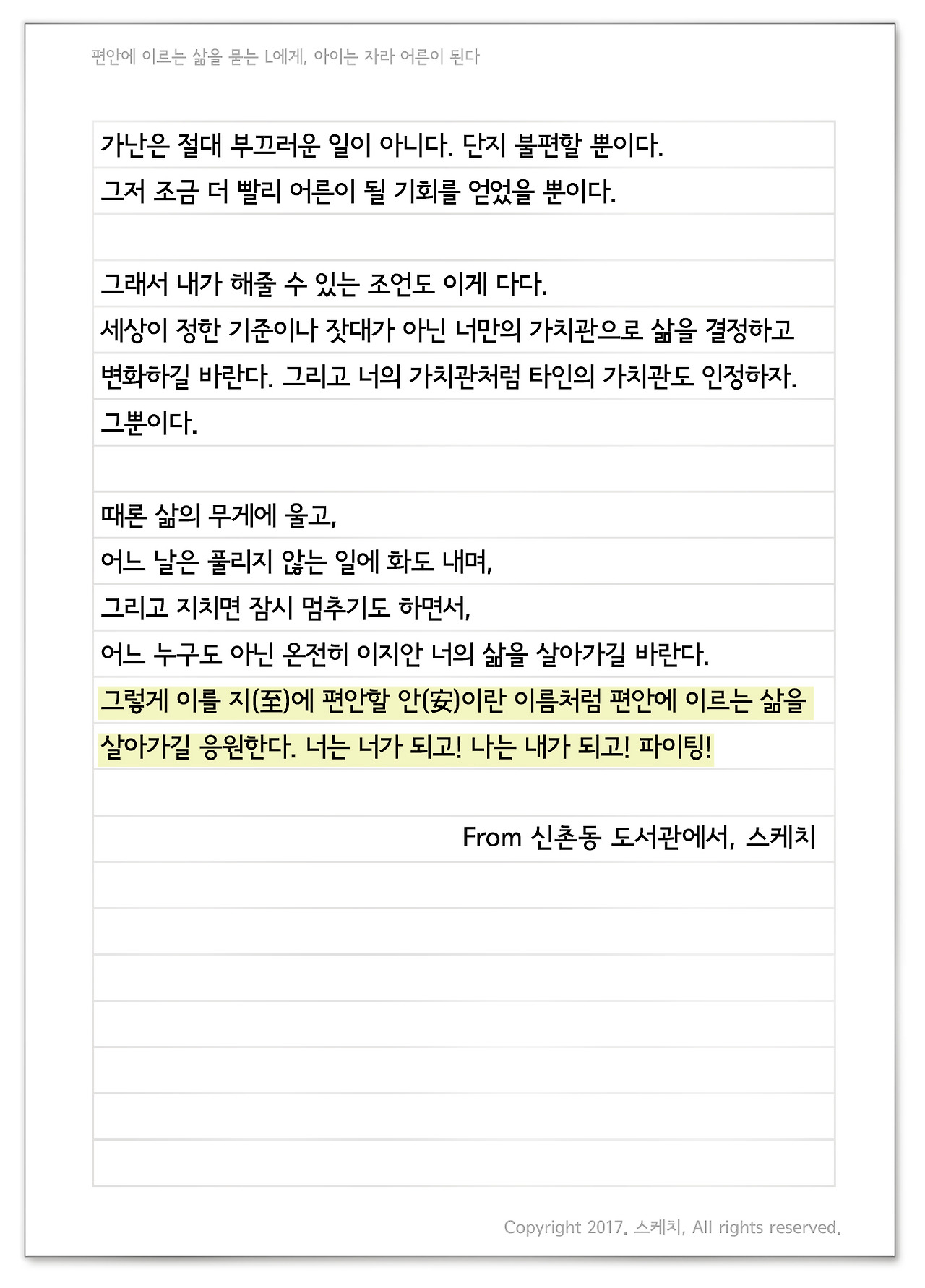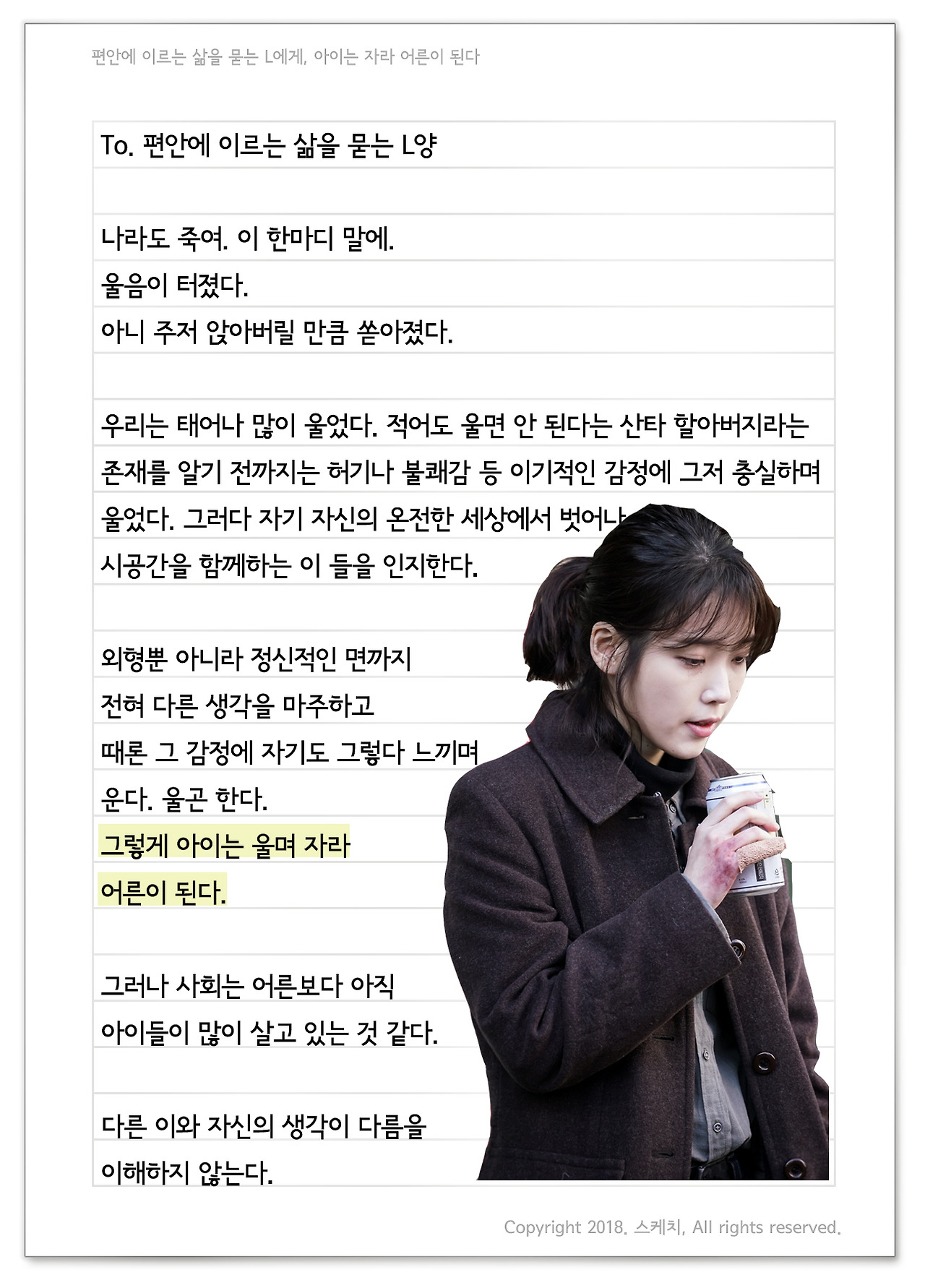 나라도 죽여. 이 한마디 말에. 울음이 터졌다. 아니 주저 앉아버릴 만큼 쏟아졌다. 우리는 태어나 많이 울었다. 적어도 울면 안 된다는 산타 할아버지라는 존재를 알기 전까지는 허기나 불쾌감 등 이기적인 감정에 그저 충실하며 울었다. 그러다 자기 자신의 온전한 세상에서 벗어나 시공간을 함께하는 이 들을 인지한다. 외형뿐 아니라 정신적인 면까지 전혀 다른 생각을 마주하고 때론 그 감정에 자기도 그렇다 느끼며 운다. 울곤 한다. 그렇게 아이는 울며 자라 어른이 된다. 그러나 사회는 어른보다 아직 아이들이 많이 살고 있는 것 같다. 다른 이와 자신의 생각이 다름을 이해하지 않는다. 자신의 생각을 타인에 강요하고 그 주장이 사회를 대변한다 소리 높이는 이를 주변에서 쉽게 접하곤 한다. 너도 알다시피 돈이 최고라는 자신의 가치관에 스스로 동조하며 돈이 많은 자신이 다른 이보다 우월하다고 여기는 이가 종종 볼 수 있지 않니? “잘 사는 사람은 좋은 사람 되기 쉬워” 기울어져 버린 세상에서 지안이 널 스스로를 피해자라고 생각할 수 있다. 쳇바퀴 도는 삶에서 답이 없을 수 있다. 그러나 세상을 바르게 살아가지 못하고, 좋은 사람이 못된 것은 가난 때문이 아니다. 혹 그렇다 하더라도 가난하지 않았다면 누구 못지않게 잘 살았을 것이라고 모든 것을 가난의 책임으로 돌려서 안된다. 그렇게 관계, 꿈, 희망을 쓰레기통에 버려서는 안된다. 정희네 가게에 모인 아저씨, 아줌마 이야기를 듣다 보면 평범해 보이는 일상에서도 그들은 삶, 꿈, 가치관, 일, 사랑 그리고 희망을 이야기한다. 참치 사주고 싶은 것이 꿈이기도 하고, 누군가 알아주지 않아도 중요한 것을 내 일로 여기며, 가끔 내 안부를 물어 봐주는 것에 감사한다. 적어도 그들은 서로 말하고 공감한다. 비록 배 나오고, 헝클어진 머리, 왜 이렇게 모이면 술만 먹는지 이해가 되지 않는 시시한 삶일지라도 시멘트처럼 딱딱하게 굳어 있던 네 마음이 그들의 이야기로 조금은 말랑말랑한 마시멜로가 되었다면 그들의 이야기는 좋은 조언이지 않을까? 세상에 많은 조언이 있다. 보통 시간이 해결해준다며 현실 도피하라는 조언이 있고, 이 길이 옳다고 내게 변화를 요구하는 조언이 있다. 그러나 “위급한 환자에게 조금만 기다려 주세요”라고 말하는 것이 좋은 해결 방식은 아니듯 조언은 현실 지향적이어야지 사후 수술이 되어서는 안 된다. 또한 자신의 연륜이나 경험을 토대로 이 길이 무조건 옳다고 강요하는 것도 좋은 조언은 아니다. 조언은 예지(知)여야지 예견(見)이 되어서는 안 된다. 당사자의 선택에 도움을 줘야지. 당사자의 선택을 결정해버리면 안 된다. 사실 경제사정이 그다지 순조롭지 못한 사람은 삶의 결정에서 소극적인 성향을 갖는다. 그러나 조언은 그야말로 도울 조(助)인 뿐, 삶의 결정은 조언을 듣고 당사자가 스스로 결정해야만 한다. “옛날 일 아무것도 아냐” “네가 대수롭지 않게 받아들이면, 남들도 대수롭지 않게 생각해” 투잡, 쓰리잡을 가져도 버는 족족 돈이 사라진다. 그래서 하루 벌어 하루 살지라도. 그럼에도 불구하고 돈을 모아야 한다. 투자도 해야 한다. 그래야 네 삶에 변화를 만들어 낼 수 있다. 네가 바꾸고자 하면 바꿀 수 있다. 반드시 변화할 수 있다. 가난은 절대 부끄러운 일이 아니다. 단지 불편할 뿐이다. 그저 조금 더 빨리 어른이 될 기회를 얻었을 뿐이다. 그래서 내가 해줄 수 있는 조언도 이게 다다. 세상이 정한 기준이나 잣대가 아닌 너만의 가치관으로 삶을 결정하고 변화하길 바란다. 그리고 너의 가치관처럼 타인의 가치관도 인정하자. 그뿐이다. 때론 삶의 무게에 울고, 어느 날은 풀리지 않는 일에 화도 내며, 그리고 지치면 잠시 멈추기도 하면서, 어느 누구도 아닌 온전히 이지안 너의 삶을 살아가길 바란다. 그렇게 이를 지(至)에 편안할 안(安)이란 이름처럼 편안에 이르는 삶을 살아가길 응원한다. 너는 너가 되고! 나는 내가 되고! 파이팅!