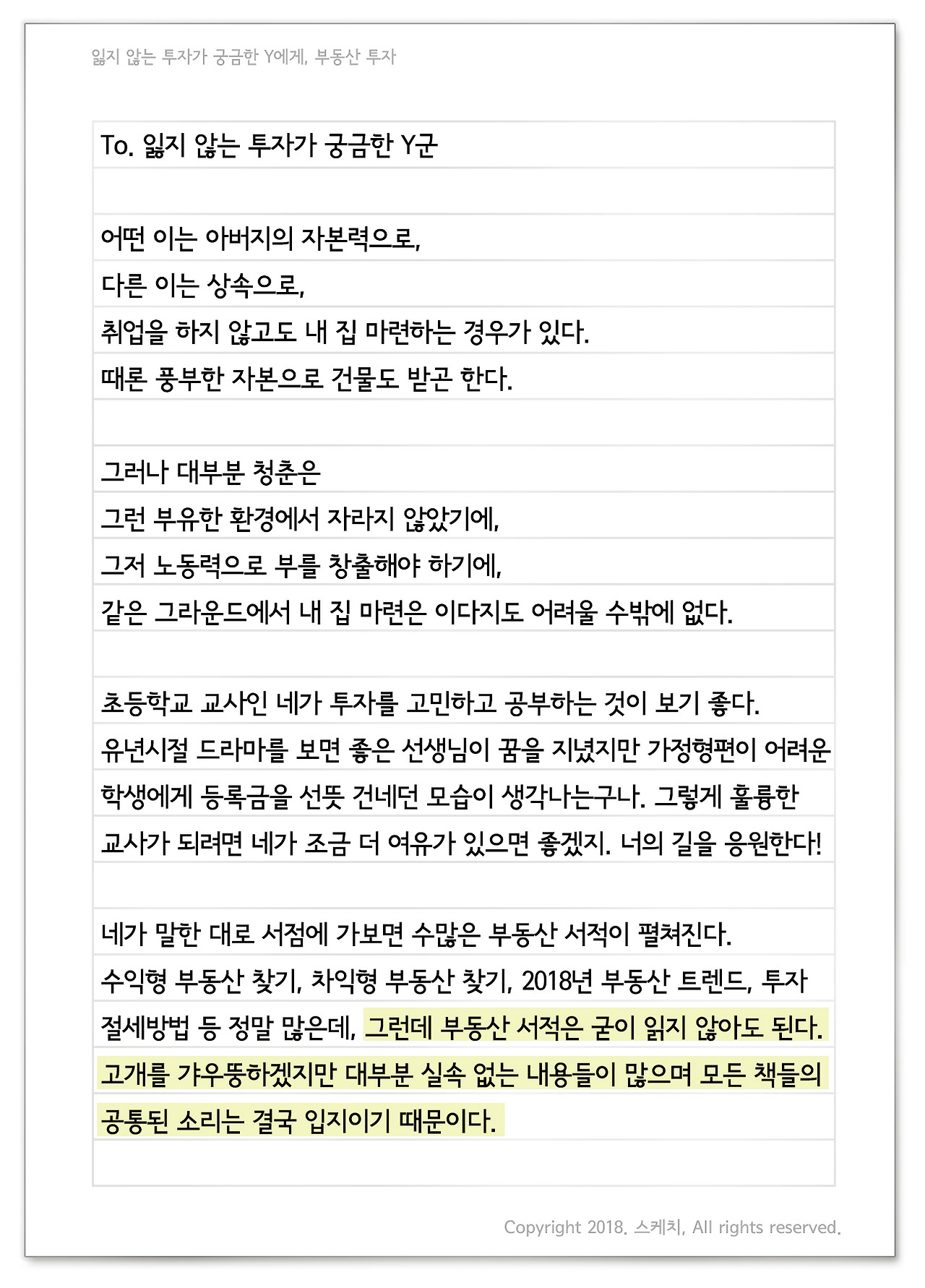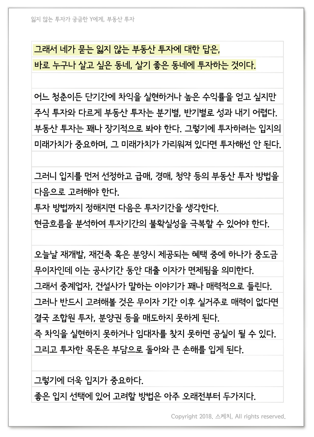 어떤 이는 아버지의 자본력으로, 다른 이는 상속으로, 취업을 하지 않고도 내 집 마련하는 경우가 있다. 때론 풍부한 자본으로 건물도 받곤 한다. 그러나 대부분 청춘은 그런 부유한 환경에서 자라지 않았기에, 그저 노동력으로 부를 창출해야 하기에, 같은 그라운드에서 내 집 마련은 이다지도 어려울 수밖에 없다. 초등학교 교사인 네가 투자를 고민하고 공부하는 것이 보기 좋다. 유년시절 드라마를 보면 좋은 선생님이 꿈을 지녔지만 가정형편이 어려운 학생에게 등록금을 선뜻 건네던 모습이 생각나는구나. 그렇게 훌륭한 교사가 되려면 네가 조금 더 여유가 있으면 좋겠지. 너의 길을 응원한다! 네가 말한 대로 서점에 가보면 수많은 부동산 서적이 펼쳐진다. 수익형 부동산 찾기, 차익형 부동산 찾기, 2018년 부동산 트렌드, 투자 절세방법 등 정말 많은데, 그런데 부동산 서적은 굳이 읽지 않아도 된다. 고개를 갸우뚱하겠지만 대부분 실속 없는 내용들이 많으며 모든 책들의 공통된 소리는 결국 입지이기 때문이다. 그래서 네가 묻는 잃지 않는 부동산 투자에 대한 답은, 바로 누구나 살고 싶은 동네, 살기 좋은 동네에 투자하는 것이다. 어느 청춘이든 단기간에 차익을 실현하거나 높은 수익률을 얻고 싶지만 주식 투자와 다르게 부동산 투자는 분기별, 반기별로 성과 내기 어렵다. 부동산 투자는 꽤나 장기적으로 봐야 한다. 그렇기에 투자하려는 입지의 미래가치가 중요하며, 그 미래가치가 가리워져 있다면 투자해선 안 된다. 그러니 입지를 먼저 선정하고 급매, 경매, 청약 등의 부동산 투자 방법을 다음으로 고려해야 한다. 투자 방법까지 정해지면 다음은 투자기간을 생각한다. 현금흐름을 분석하여 투자기간의 불확실성을 극복할 수 있어야 한다. 오늘날 재개발, 재건축 혹은 분양시 제공되는 혜택 중에 하나가 중도금 무이자인데 이는 공사기간 동안 대출 이자가 면제됨을 의미한다. 그래서 중계업자, 건설사가 말하는 이야기가 꽤나 매력적으로 들린다. 그러나 반드시 고려해볼 것은 무이자 기간 이후 실거주로 매력이 없다면 결국 조합원 투자, 분양권 등을 매도하지 못하게 된다. 즉 차익 실현하지 못하거나 임대자를 찾지 못해 공실이 될 수 있다. 따라서 투자한 목돈은 부담으로 돌아와 큰 손해를 입는다. 그렇기에 더욱 입지가 중요하다. 좋은 입지 선택에 있어 고려할 방법은 아주 오래전부터 두가지다. 하나, 예전부터 사람들이 살던 지역을 생각하면 쉽다. 예전부터 사람들이 살던 곳은 산이나 강의 정기를 보고 마을의 터로서 살았던 풍수지리가 곳이라 좋다. 사람이 모여사는 곳은 앞으로도 살기 좋은 입지다. 둘째, 도시계획을 고려하여 발전 지역으로 결정한다. 수많은 부동산 서적에서 뭐라 하든, 결국 개발되는 지역은 작가가 아니라