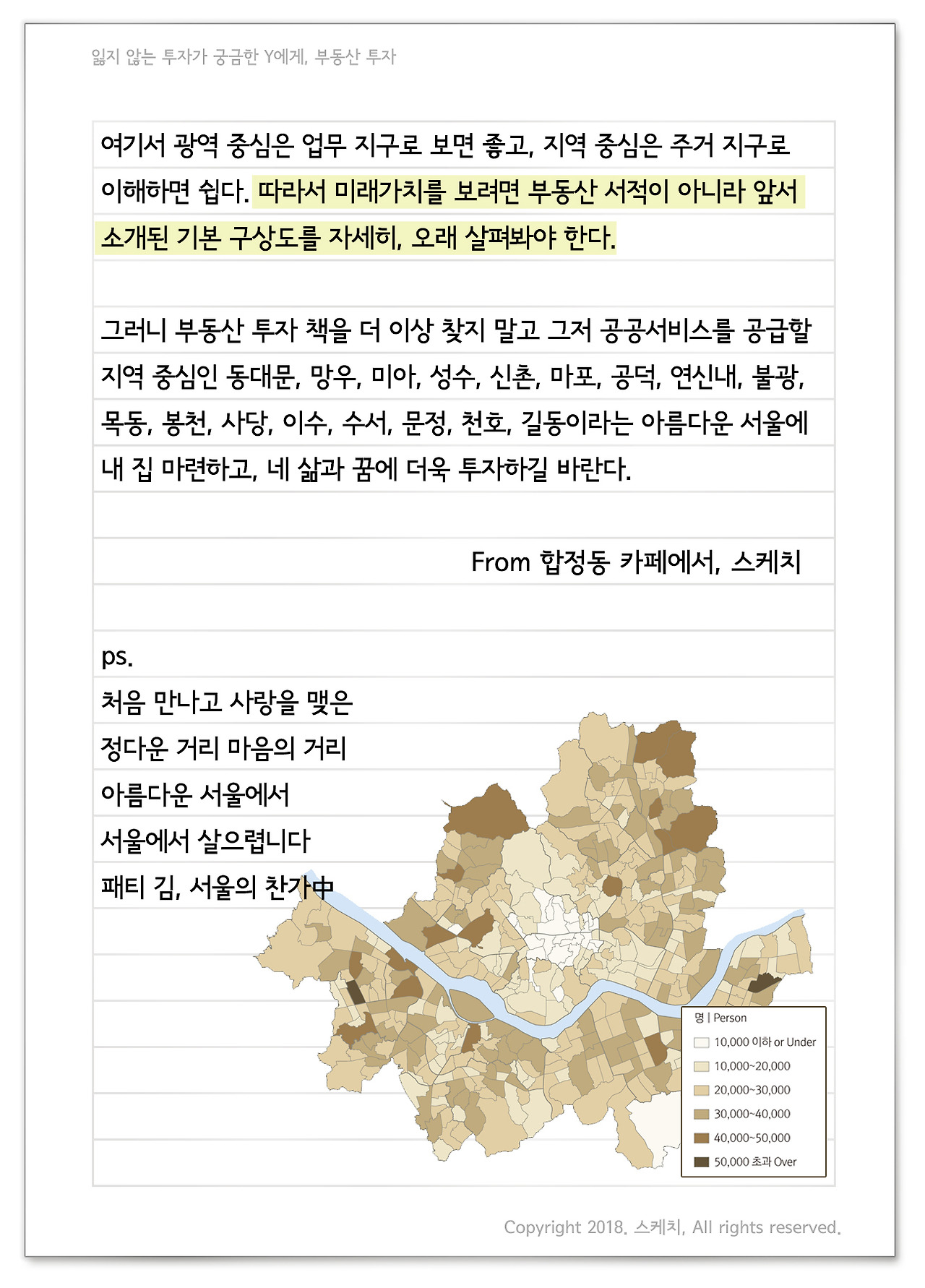 처음 만나고 사랑을 맺은 정다운 거리 마음의 거리 아름다운 서울에서 서울에서 살으렵니다 패티 김, 서울의 찬가中 그러니 부동산 투자 책을 더 이상 찾지 말고 그저 공공서비스를 공급할 지역 중심인 동대문, 망우, 미아, 성수, 신촌, 마포, 공덕, 연신내, 불광, 목동, 봉천, 사당, 이수, 수서, 문정, 천호, 길동이라는 아름다운 서울에 내 집 마련을 하고, 네 삶과 꿈에 더욱 투자하길 바란다.