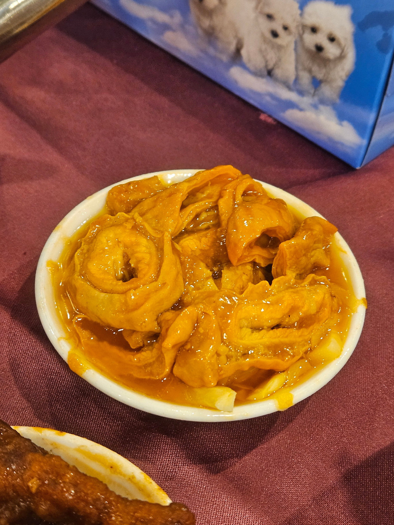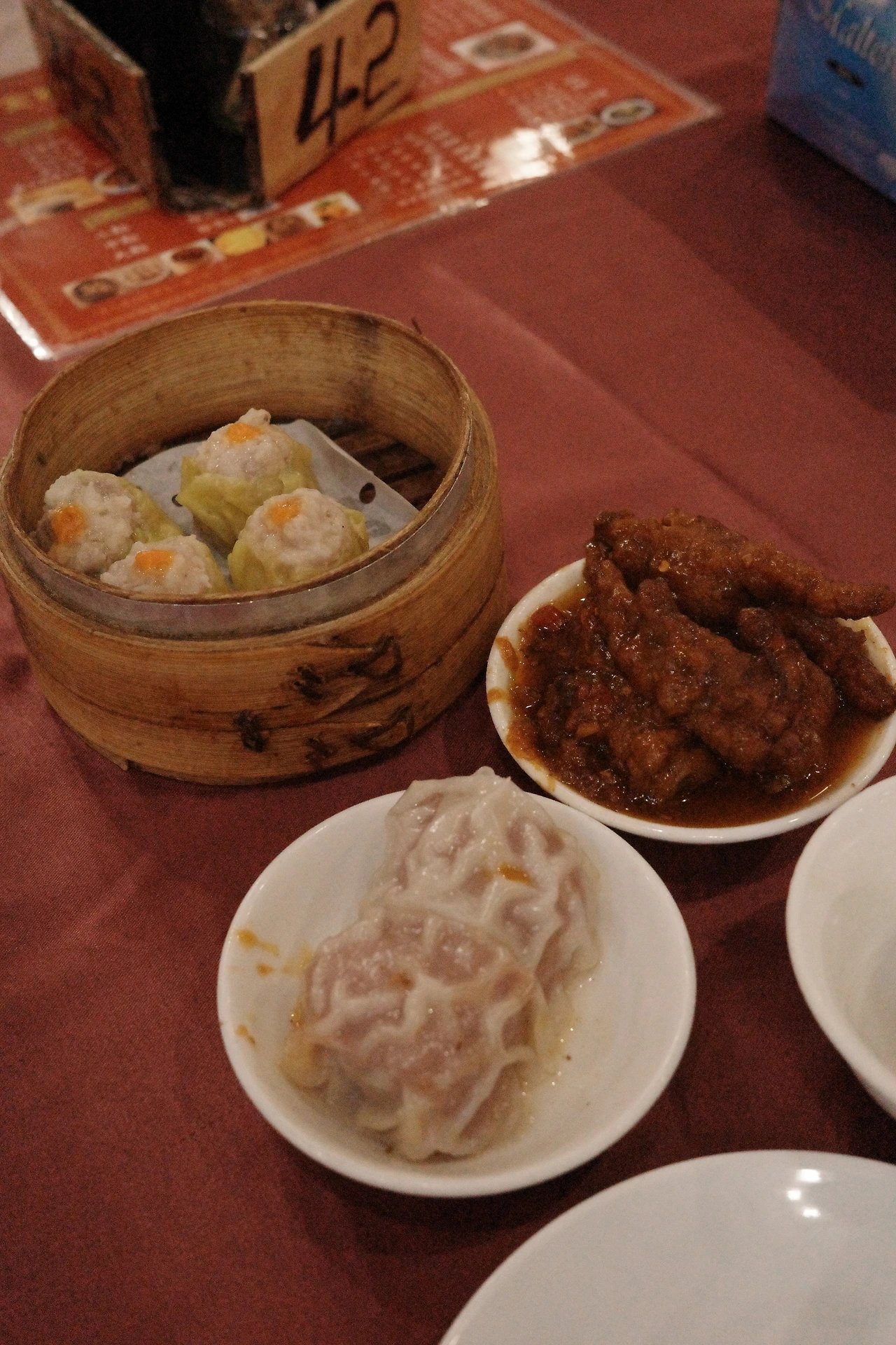 저는 새우 만두인 샤오마이, 그리고 정체를 알 수 없는 커다란 고깃덩어리 만두, 또 닭발 조림, 곱창 조림, 새우 창펀을 카트에서 꺼내 왔습니다. 눈이 번쩍 뜨이는 맛은 아니지만, 꽤 맛있기는 합니다. 샤오마이 새우 결도 잘 살아 있고, 창펀도 부들부들하니 잘 넘어가며, 곱창은 살짝 향은 나지만 거부감 들 정도는 아니었습니다. 닭발 양념도 칠리처럼 달달한 감칠맛 좋았고요. 저기에 우롱차 한 주전자까지 해서 한 3만7000원 정도 나왔던 것 같습니다. 계산을 하지 않고 막 먹었더니 대만 치고는 엄청나게 비싸게 값을 치렀습니다. 딤섬 카트에 없는 딤섬 메뉴는 별도로 주문할 수 있고, 요리 종류도 시킬 수 있습니다. 단체 손님들 많이 오더라고요. 다들 요리 시켜 놓고 딤섬 몇 개 더 가져다가 먹는 모습을 살펴볼 수 있었습니다.