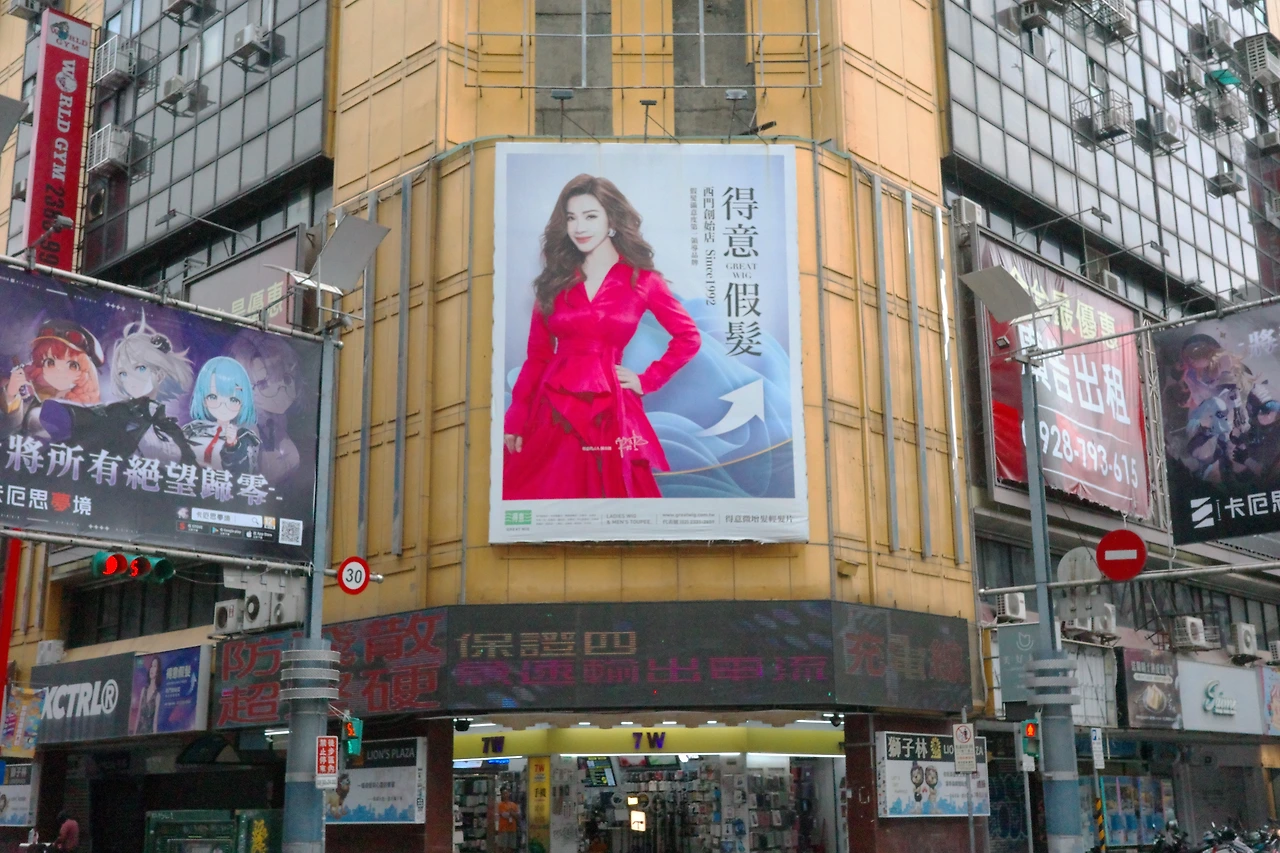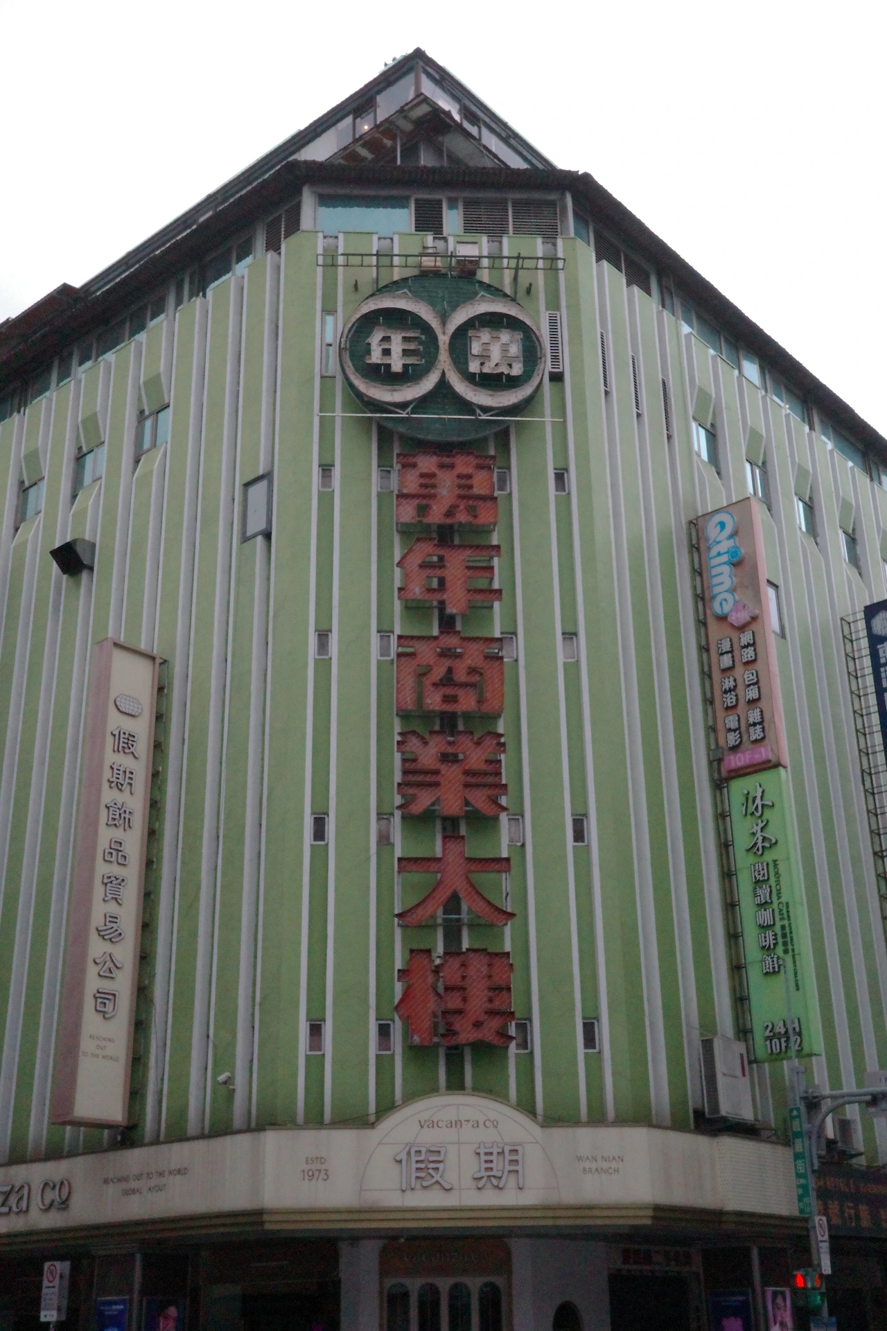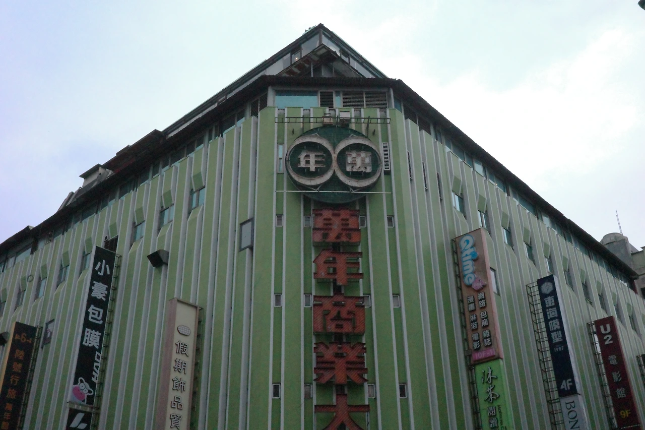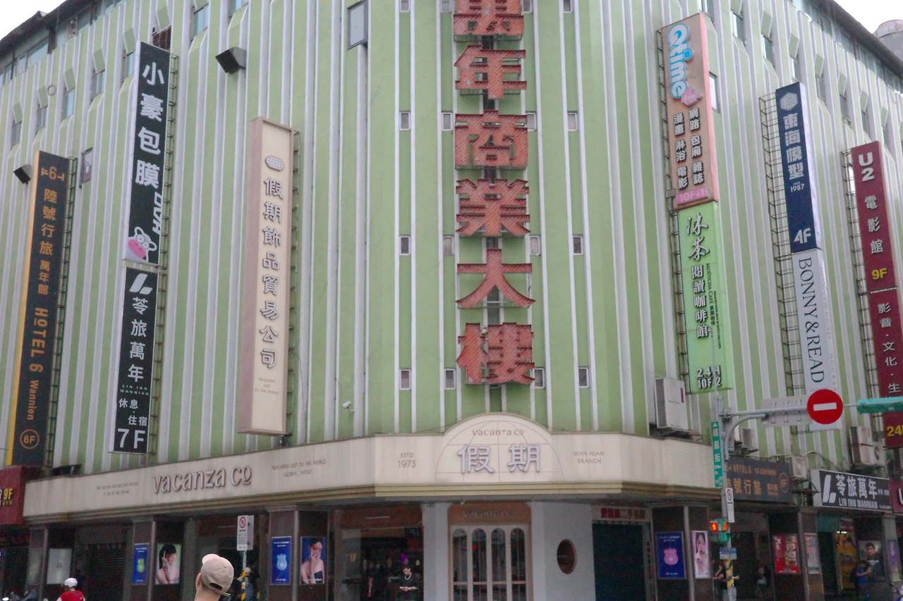 사자림 쇼핑몰과 쌍벽을 이루는 시먼딩의 또다른 랜드마크, 만년 쇼핑몰로 발걸음을 옮겨 보겠습니다. 별로 멀지 않은 곳에 떨어져 있습니다. 만년 쇼핑몰은 사자림보다 6년 앞선 1973년 처음 문을 열었습니다. 원래 일제 시대 때부터 여기에 유명한 '국제 극장'이 있었는데, 그걸 갈아엎고 새로 만든 대형 건물이라고 하네요. 사자림 건물과는 달리 빛바랜 초록색이 상당히 눈에 띄고, 특히 붉은색으로 걸린 간판이 보색 대비를 이뤄 밤이 되면 눈에 잘 띕니다.