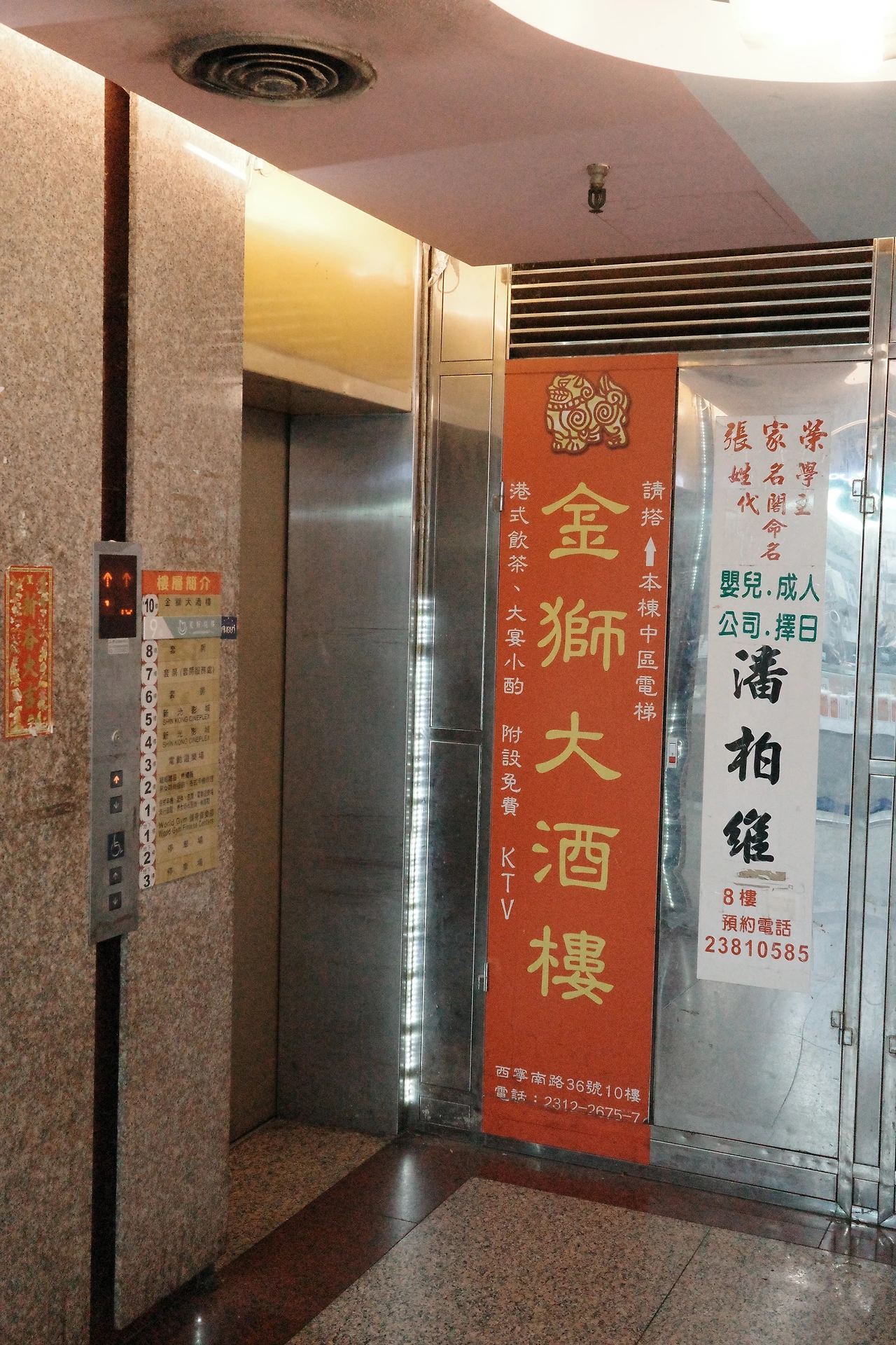 이제 이 건물이 과거에 누렸던 권세와 영광을 유추해 볼 수 있는 10층 꼭대기 식당 '사자대주루'로 향합니다. 이 빌딩이 세워지자마자 들어왔는지는 정확히 못 찾겠는데, 아무튼 45년 가까이 운영했다고 하죠. (맨 오른쪽 사진은 엘레베이터 천장 사진입니다.) 예전 홍콩, 대만, 중국 등 중화권 영화에서만 보던 빈티지하게 화려한 식당이 눈앞에 펼쳐집니다.